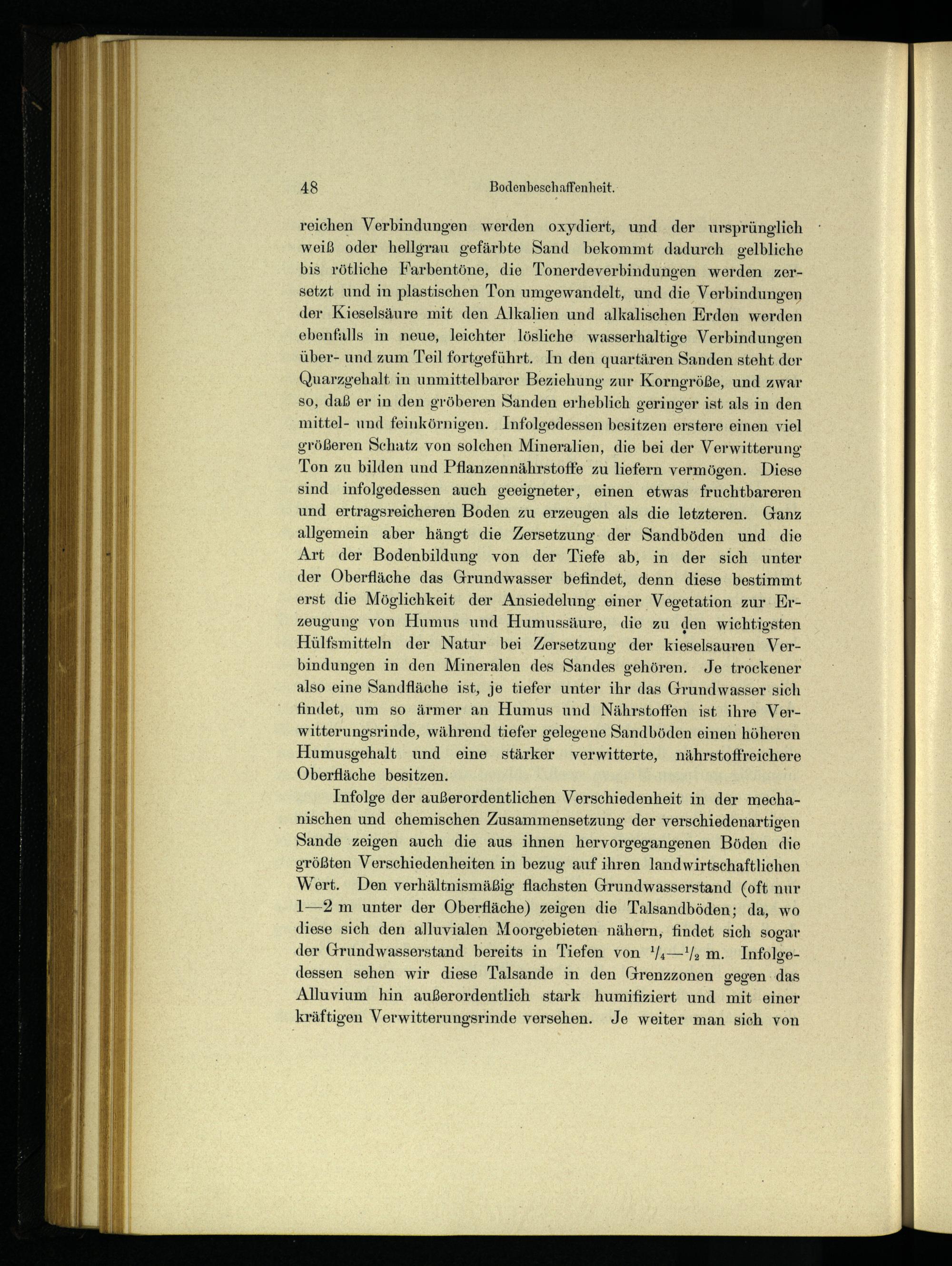 reichen Verbindungen werden oxydiert, und der ursprünglich weiß oder hellgrau gefärbte Sand bekommt dadurch gelbliche bis rötliche Farbentöne, die Tonerdeverbindungen werden zersetzt und in plastischen Ton umgewandelt, und die Verbindungen der Kieselsäure mit den Alkalien und alkalischen Erden werden ebenfalls in neue, leichter lösliche wasserhaltige Verbindungen über- und zum Teil fortgeführt. In den quartären Sanden steht der Quarzgehalt in unmittelbarer Beziehung zur Korngröße, und zwar so, daß er in den gröberen Sanden erheblich geringer ist als in den mittel- und feinkörnigen. Infolgedessen besitzen erstere einen viel größeren Schatz von solchen Mineralien, die bei der Verwitterung Ton zu bilden und Pflanzennährstoffe zu liefern vermögen. Diese sind infolgedessen auch geeigneter, einen etwas fruchtbareren und ertragsreicheren Boden zu erzeugen als die letzteren. Ganz allgemein aber hängt die Zersetzung: der Sandböden und die Art der Bodenbildung von der Tiefe ab, in der sich unter der Oberfläche das Grundwasser befindet, denn diese bestimmt erst die Möglichkeit der Ansiedelung einer Vegetation zur Erzeugung von Humus und Humussäure, die zu den wichtigsten Hülfsmitteln der Natur bei Zersetzung der kieselsauren Verbindungen in den Mineralen des Sandes gehören. Je trockener also eine Sandfläche ist, je tiefer unter ihr das Grundwasser sich findet, um so ärmer an Humus und Nährstoffen ist ihre Verwitterungsrinde, während tiefer gelegene Sandböden einen höheren Humusgehalt und eine stärker verwitterte, nährstoffreichere Oberfläche besitzen.