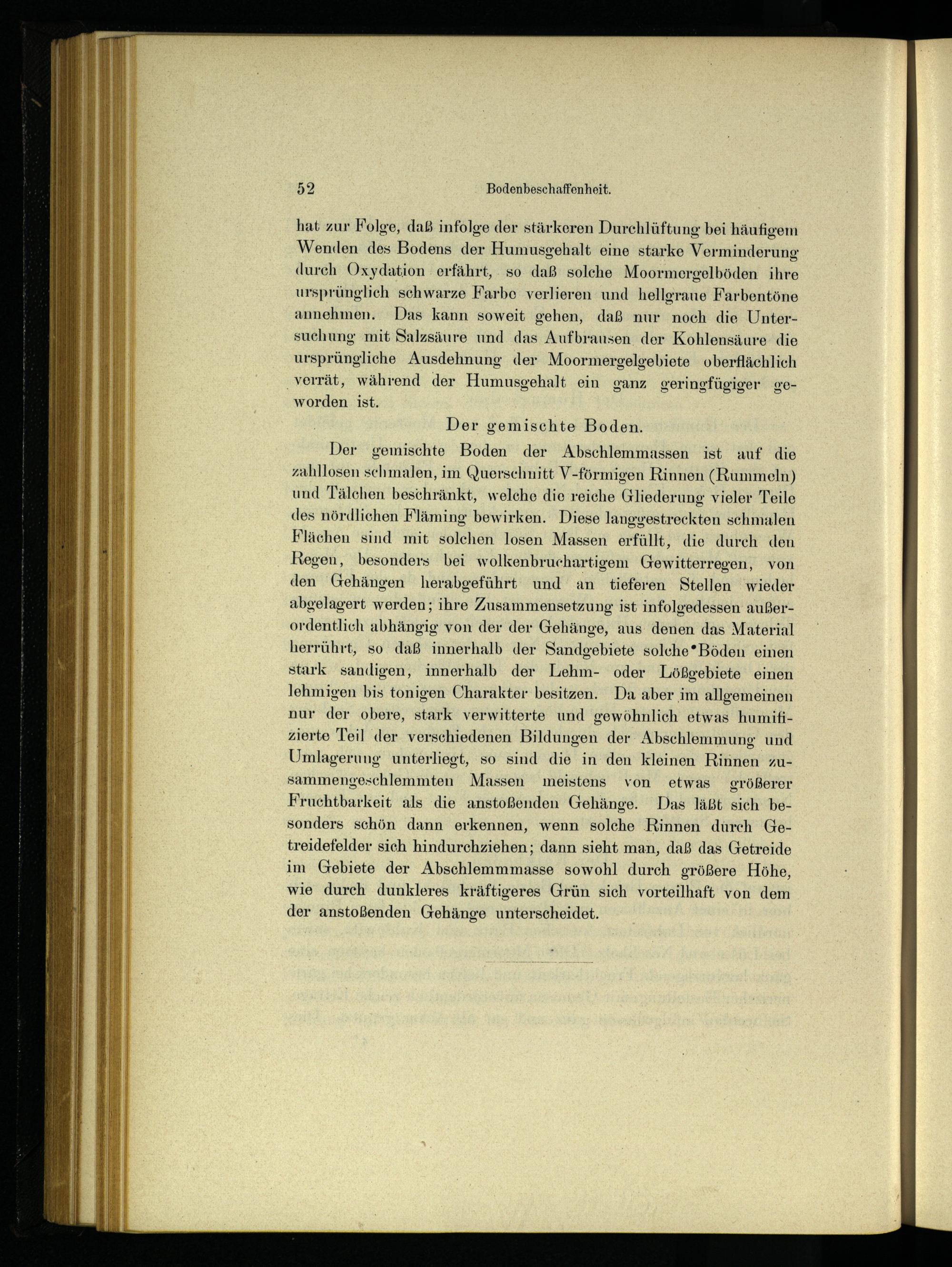 hat zur Folge, daß infolge der stärkeren Durchlüftung bei häufigem Wenden des Bodens der Humusgehalt eine starke Verminderung durch Oxydation erfährt, so daß solche Moormergelböden ihre ursprünglich schwarze Farbo verlieren und hellgrane Farbentöne annehmen. Das kann soweit gehen, daß nur noch die Untersuchung mit Salzsäure und das Aufbrausen der Kohlensäure die ursprüngliche Ausdehnung der Moormergelgebiete oberflächlich ‚verrät, während der Humusgehalt ein ganz geringfügiger geworden ist. Der gemischte Boden.
