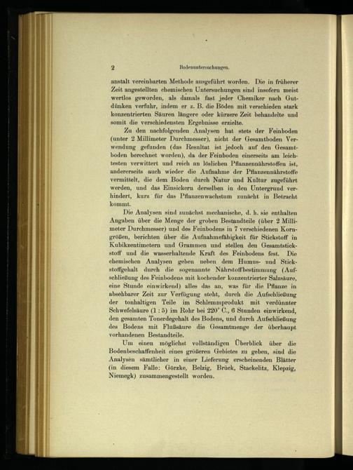 Die Analysen sind zunächst mechanische, d. h. sie enthalten Angaben über die Menge der groben Bestandteile(über 2 Millimeter Durchmesser) und des Feinbodens in 7 verschiedenen Korngrößen, berichten über die Aufnahmefähigkeit für Stickstoff in Kubikzentimetern und Grammen und stellen den Gesamtstickstoff und die wasserhaltende Kraft des Feinbodens fest. Die chemischen Analysen geben neben dem Humus- und Stickstoffgehalt durch die sogenannte Nährstoffbestimmung(Aufschließung des Feinbodens mit kochender konzentrierter Salzsäure, eine Stunde einwirkend) alles das an, was für die Pflanze in absehbarer Zeit zur Verfügung steht, durch die Aufschließung der tonhaltigen Teile im Schlemmprodukt mit verdünnter Schwefelsäure(1: 5) im Rohr bei 220° C., 6 Stunden einwirkend, den gesamten Tonerdegehalt des Bodens, und durch Aufschließung des Bodens mit Flußsäure die Gesamtmenge der überhaupt vorhandenen Bestandteile.