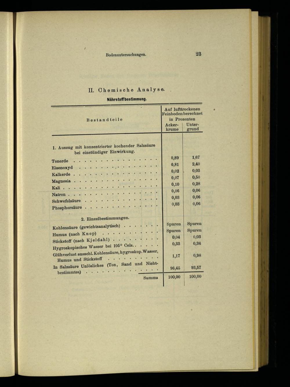 Humus(nach Knop) Stickstoff(nach Kjeldahl) Hygroskopisches Wasser bei 105° Cels.. Glühverlust ausschl. Kohlensäure, hygroskop. Wasser, Humus und Stickstoff;; In Salzsäure Unlösliches(Ton,