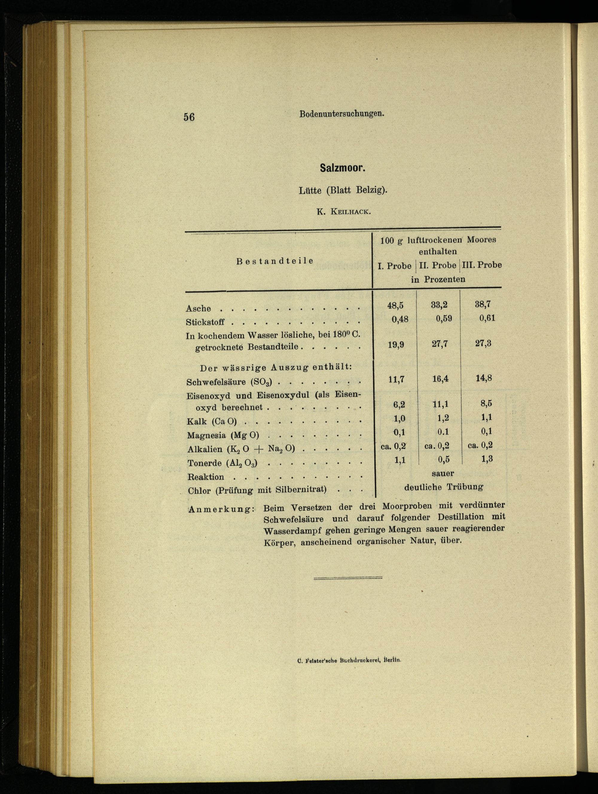 Anmerkung: Beim Versetzen der drei Moorproben mit verdünnter Schwefelsäure und darauf folgender Destillation mit Wasserdampf gehen geringe Mengen sauer reagierender Körper, anscheinend organischer Natur, über.