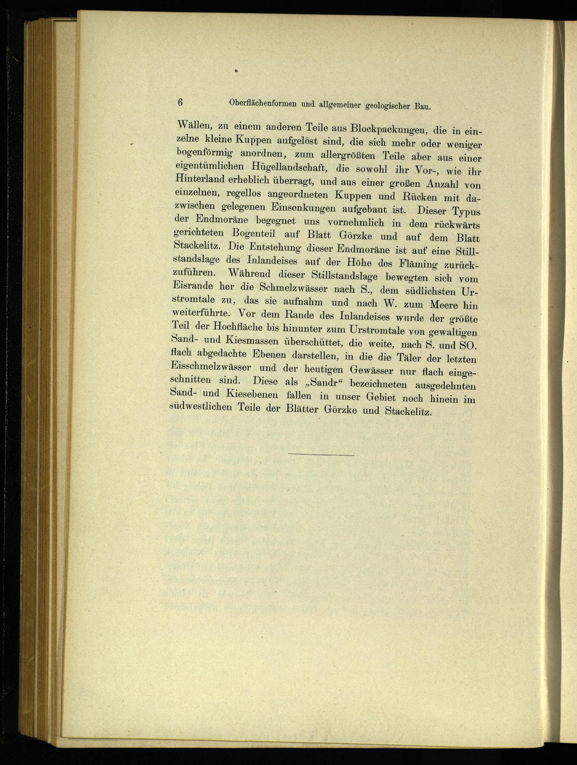 Wällen, zu einem anderen Teile aus Blockpackungen, die. in einzelne kleine Kuppen aufgelöst sind, die sich mehr oder weniger bogenförmig anordnen, zum allergrößten Teile aber aus einer eigentümlichen Hügellandschaft, die sowohl ihr V or-, wie ihr Hinterland erheblich überragt, und aus einer großen Anzahl von einzelnen, regellos angeordneten Kuppen und Rücken mit dazwischen gelegenen Einsenkungen aufgebaut ist. Dieser Typus der Endmoräne begegnet uns vornehmlich in dem rückwärts gerichteten Bogenteil auf Blatt Görzke und auf dem Blatt Stackelitz . Die Entstehung dieser Endmoräne ist auf eine Stillstandslage des Inlandeises auf der Höhe des F läming zurückzuführen. Während dieser Stillstandslage bewegten sich vom Kisrande her die Schmelzwässer nach S., dem südlichsten Urstromtale zu, das sie aufnahm und nach W. zum Meere hin weiterführte. Vor dem Rande des Inlandeises wurde der größte Teil der Hochfläche bis hinunter zum Urstromtale von gewaltigen Sand- und Kiesmassen überschüttet, die weite, nach S. und SO. flach abgedachte Ebenen darstellen, in die die Täler der letzten Kisschmelzwässer und der heutigen Gewässer nur flach eingeschnitten sind. Diese als„Sandr“ bezeichneten ausgedehnten Sand- und Kiesebenen fallen in unser Gebiet noch hinein im südwestlichen Teile der Blätter Görzke und Stackelitz .