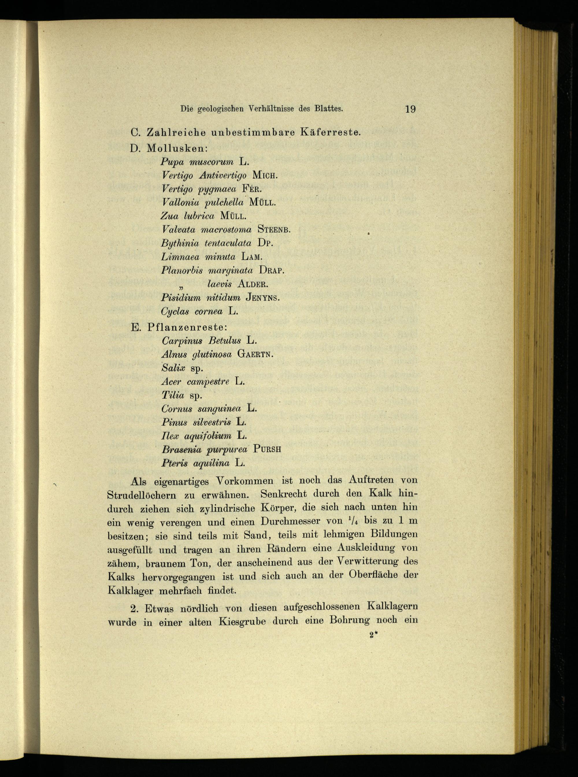 Als eigenartiges Vorkommen ist noch das Auftreten von Strudellöchern zu erwähnen. Senkrecht durch den Kalk hindurch ziehen sich zylindrische Körper, die sich nach unten hin ein wenig verengen und einen Durchmesser von*/4 bis zu 1 m besitzen; sie sind teils mit Sand, teils mit lehmigen Bildungen ausgefüllt und tragen an ihren Rändern eine Auskleidung von zühem, braunem Ton, der anscheinend aus der Verwitterung des Kalks hervorgegangen ist und sich auch an der Oberfläche der Kalklager mehrfach findet.