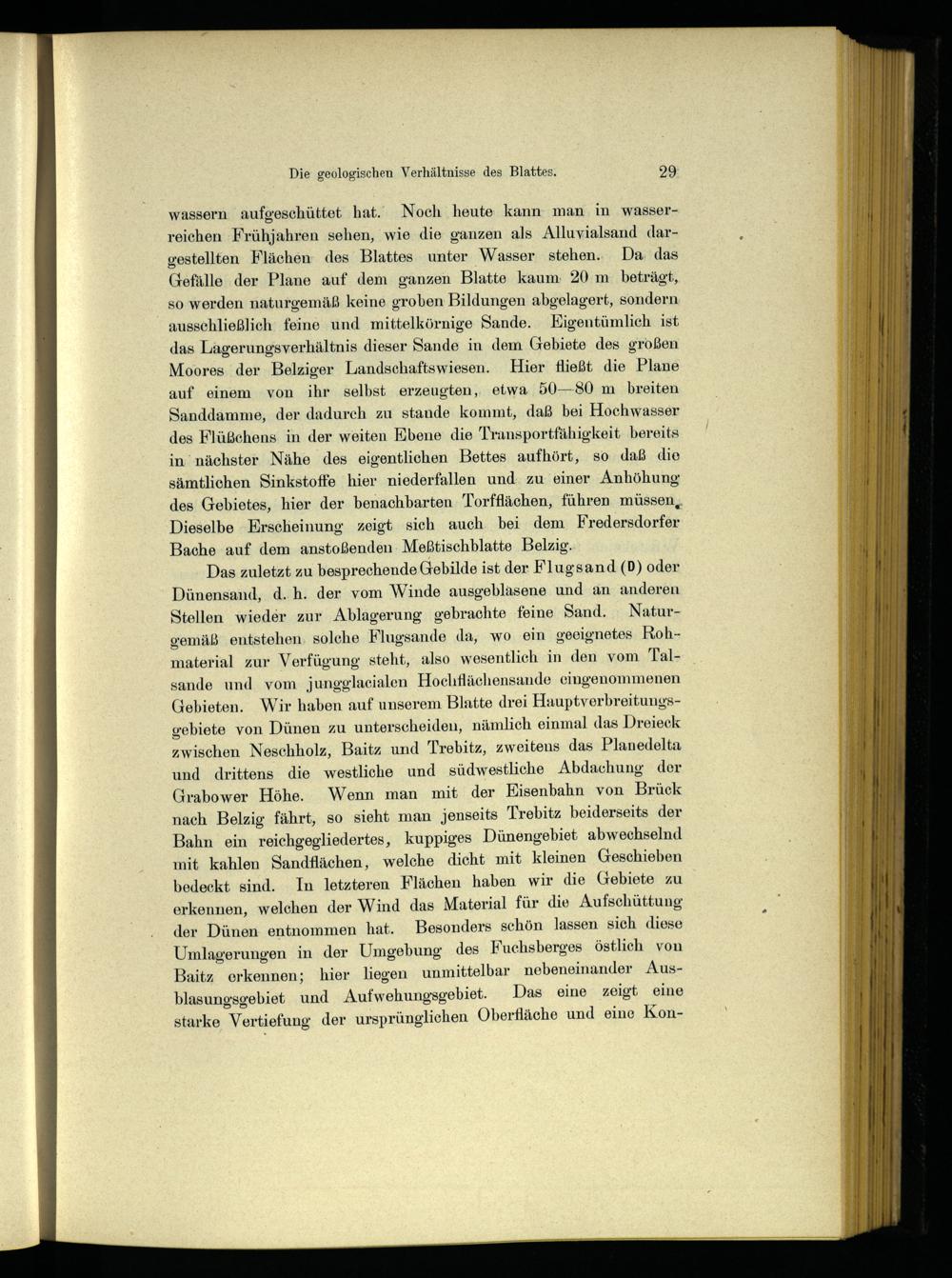 Das zuletzt zu besprechende Gebilde ist der Flugsand(D) oder Dünensand, d.h. der vom Winde ausgeblasene und an anderen Stellen wieder zur Ablagerung gebrachte feine Sand. Naturgemäß entstehen. solche Flugsande da, wo ein geeignetes Rohmaterial zur Verfügung steht, also wesentlich in den vom Talsande und vom jungglacialen Hochflächensande eingenommenen Gebieten. Wir haben auf unserem Blatte drei Hauptverbreitungsgebiete von Dünen zu unterscheiden, nämlich einmal das Dreieck zwischen Neschholz, Baitz und Trebitz, zweitens das Planedelta und drittens die westliche und südwestliche Abdachung der Grabower Höhe. Wenn man mit der Eisenbahn von Brück nach Belzig fährt, so sieht man jenseits Trebitz beiderseits der Bahn ein reichgegliedertes, kuppiges Dünengebiet abwechselnd mit kahlen Sandflächen, welche dicht mit kleinen Geschieben bedeckt sind. In letzteren Flächen haben wir die Gebiete zu erkennen, welchen der Wind das Material für die Aufschüttung der Dünen entnommen hat. Besonders schön lassen sich diese