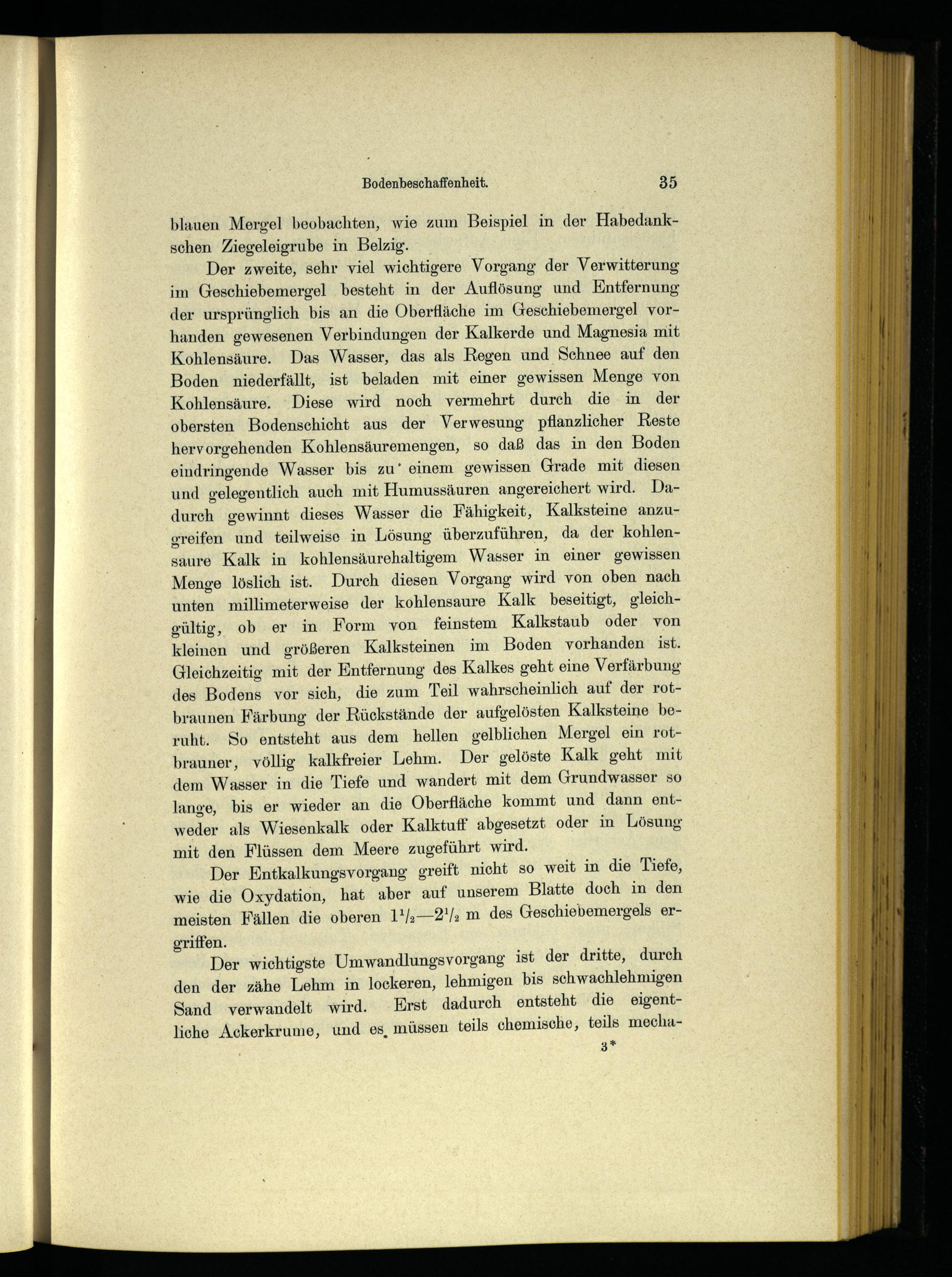 Der zweite, sehr viel wichtigere Vorgang der Verwitterung im Geschiebemergel ‚besteht in der Auflösung und Entfernung der ursprünglich bis an die Oberfläche im Geschiebemergel vorhanden gewesenen Verbindungen der Kalkerde und Magnesia mit Kohlensäure. Das Wasser, das als Regen und Schnee auf den Boden niederfällt, ist beladen mit einer gewissen Menge von Kohlensäure. Diese wird noch vermehrt durch die in der obersten Bodenschicht aus der Verwesung pflanzlicher Reste hervorgehenden Kohlensäuremengen, so daß das in den Boden eindringende Wasser bis zu’ einem gewissen Grade mit diesen und gelegentlich auch mit Humussäuren angereichert wird. Dadurch gewinnt dieses Wasser die Fähigkeit, Kalksteine anzugreifen und teilweise in Lösung überzuführen, da der kohlensaure Kalk in kohlensäurehaltigem Wasser in einer gewissen Menge löslich ist. Durch diesen Vorgang wird von oben nach unten millimeterweise der kohlensaure Kalk beseitigt, gleichgültig, ob er in Form von feinstem Kalkstaub oder von kleinen und größeren Kalksteinen im Boden vorhanden ist. Gleichzeitig mit der Entfernung des Kalkes geht eine Verfärbung des Bodens vor sich, die zum Teil wahrscheinlich auf der rotbraunen Färbung der Rückstände der aufgelösten Kalksteine beruht. So entsteht aus dem hellen gelblichen Mergel ein rotbrauner, völlig kalkfreier Lehm. Der gelöste Kalk geht mit dem Wasser in die Tiefe und wandert mit dem Grundwasser so lange, bis er wieder an die Oberfläche kommt und dann entweder als Wiesenkalk oder Kalktuff abgesetzt oder in Lösung mit den Flüssen dem Meere zugeführt wird.