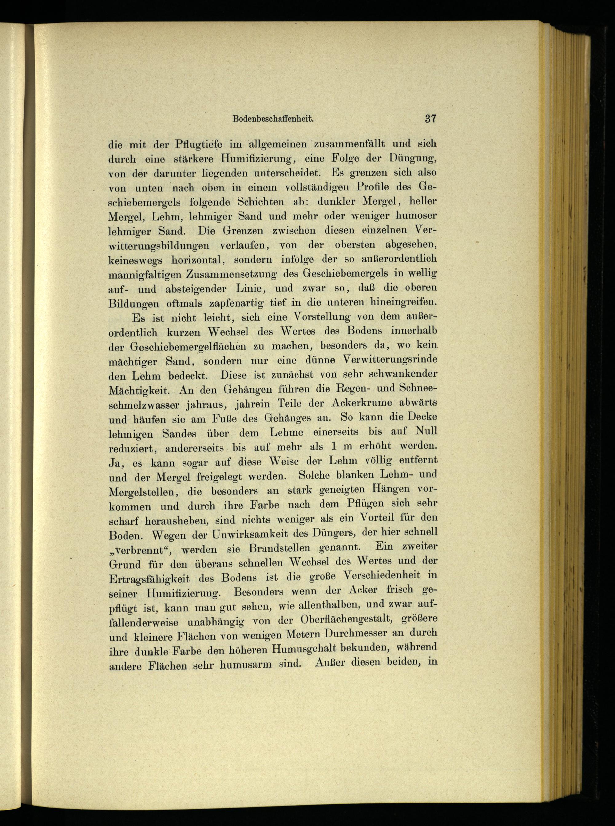 Es ist nicht leicht, sich eine Vorstellung von dem außerordentlich kurzen Wechsel des Wertes des Bodens innerhalb der Geschiebemergelflächen zu machen, besonders da, wo kein mächtiger Sand, sondern nur eine dünne Verwitterungsrinde den Lehm bedeckt. Diese ist zunächst von sehr schwankender Mächtigkeit. An den Gehängen führen die Regen- und Schneeschmelzwasser jahraus, jahrein Teile der Ackerkrume abwärts und häufen sie am Fuße des Gehänges an. So kann die Decke Jehmigen Sandes über dem Lehme einerseits bis auf Null reduziert, andererseits bis auf mehr als 1 m erhöht werden. Ja, es kann sogar auf diese Weise der Lehm völlig entfernt und der Mergel freigelegt werden. Solche blanken Lehm- und Mergelstellen, die besonders an stark geneigten Hängen vorkommen und durch ihre Farbe nach dem Pflügen sich sehr scharf herausheben, sind nichts weniger als ein Vorteil für den Boden. Wegen der Unwirksamkeit des Düngers, der hier schnell „verbrennt“, werden sie Brandstellen genannt. Kin zweiter Grund für den überaus schnellen Wechsel des Wertes und der Ertragsfähigkeit des Bodens ist die große Verschiedenheit in seiner Humifizierung. Besonders wenn der Acker frisch gepflügt ist, kann man gut sehen, wie allenthalben, und zwar auffallenderweise unabhängig von der Oberflächengestalt, größere und kleinere Flächen von wenigen Metern Durchmesser an durch ihre dunkle Farbe den höheren Humusgehalt bekunden, während andere Flächen sehr humusarm sind. Außer diesen beiden, in