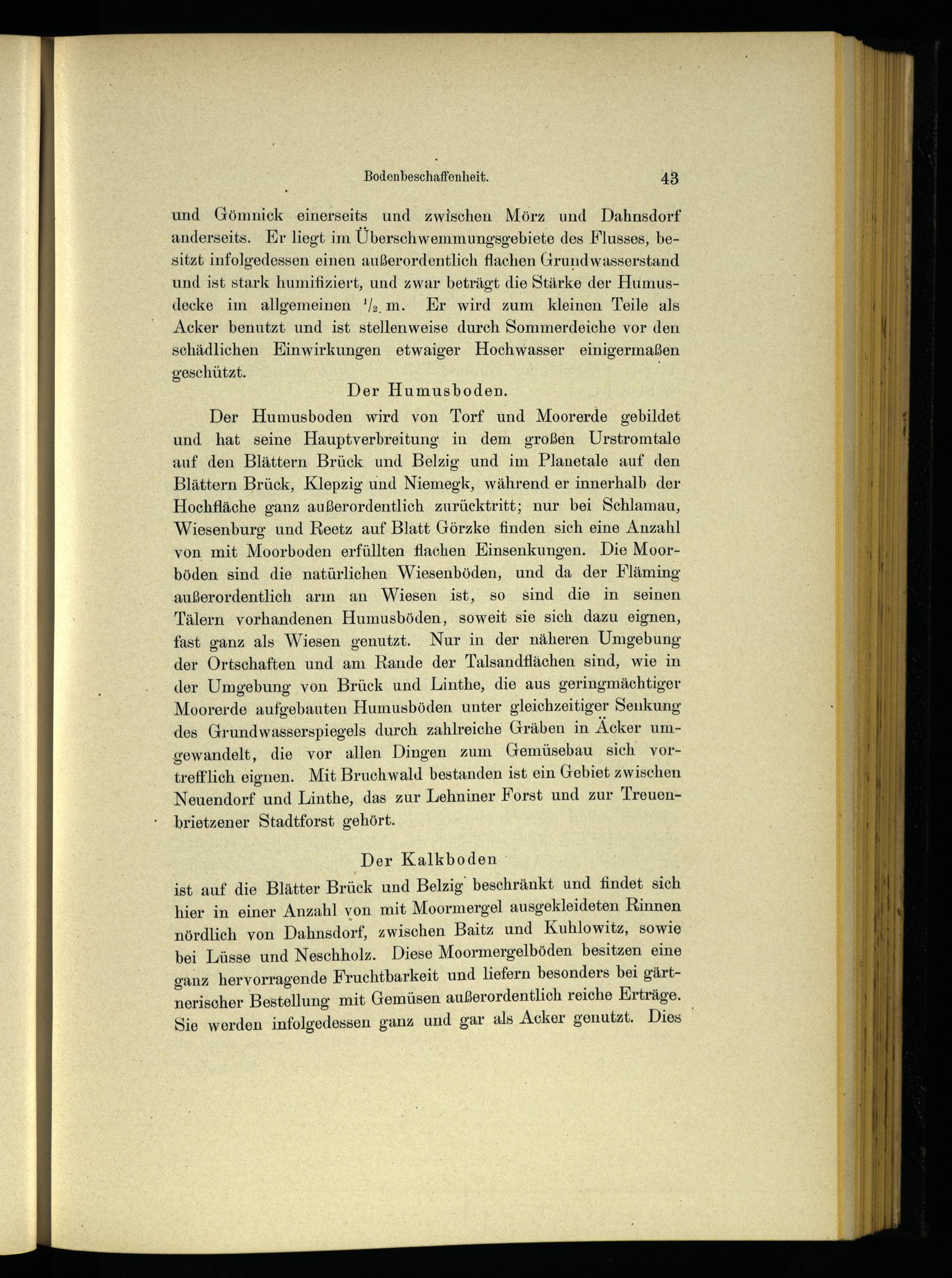 Der Humusboden wird von Torf und Moorerde gebildet und hat seine Hauptverbreitung in dem großen Urstromtale auf den Blättern Brück und Belzig und im Planetale auf den Blättern Brück , Klepzig und Niemegk , während er innerhalb der Hochfläche ganz außerordentlich zurücktritt; nur bei Schlamau, Wiesenburg und Reetz auf Blatt Görzke finden sich eine Anzahl von mit Moorboden erfüllten flachen Einsenkungen. Die Moorböden sind die natürlichen Wiesenböden, und da der Fläming außerordentlich arın an Wiesen ist, so sind die in seinen Tälern vorhandenen Humusböden, soweit sie sich dazu eignen, fast ganz als Wiesen genutzt. Nur in der näheren Umgebung der Ortschaften und. am Rande der Talsandflächen sind, wie in der Umgebung von Brück und Linthe , die aus geringmächtiger Moorerde aufgebauten Humusböden unter gleichzeitiger Senkung des Grundwasserspiegels durch zahlreiche Gräben in Äcker umgewandelt, die vor allen Dingen zum Gemüsebau sich vortrefflich eignen. Mit Bruchwald bestanden ist ein Gebiet zwischen Neuendorf und Linthe , das zur Lehniner Forst und zur Treuen brietzener Stadtforst gehört.