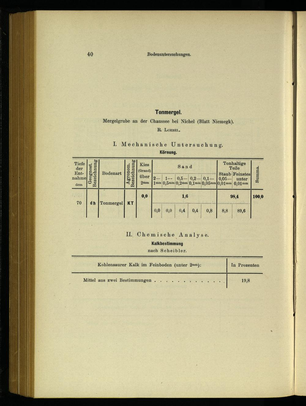 Körnung. %&&. «. N Tonhalt Tiefe 7 2 3] E} Kies Sand il 69 Ss der[SE S 3|(Grand) ES g Ent-| 58| Bodenart| 28 DD Staub Feinstes|& nahme| 5 8 8|“9er|9—| 1-- 0,5— 0,2— 0,1—|0,05— unter® im 198< 8] arm| 1mm 0,5mm 0,2mm 0,1mm 0,05mm[0,01mm 0,01:mm