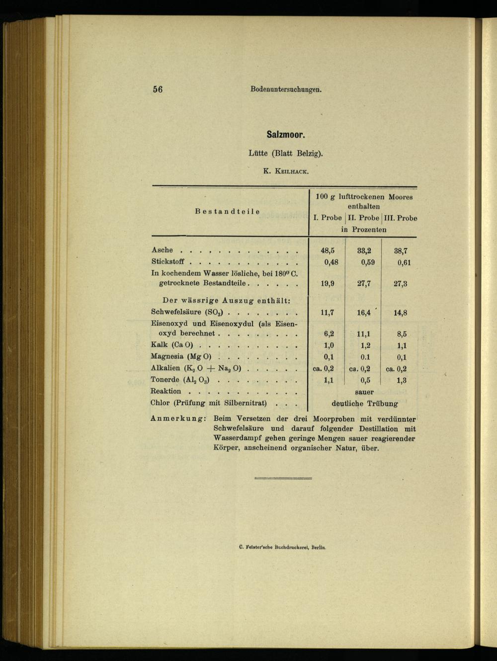 Anmerkung: Beim Versetzen der drei Moorproben mit verdünnter' Schwefelsäure und darauf folgender Destillation mit Wasserdampf gehen geringe Mengen sauer reagierender Körper, anscheinend organischer Natur, über.