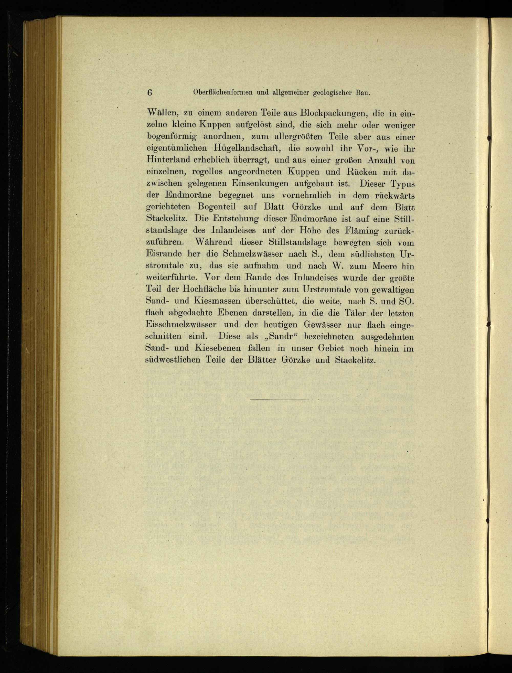 Wällen, zu einem anderen Teile aus Blockpackungen, die in einzelne kleine Kuppen aufgelöst sind, die sich mehr oder weniger bogenförmig anordnen, zum allergrößten Teile aber aus einer eigentümlichen Hügellandschaft, die sowohl ihr Vor-, wie ihr Hinterland erheblich überragt, und aus einer großen Anzahl von einzelnen, regellos angeordneten Kuppen und Rücken mit dazwischen gelegenen Einsenkungen aufgebaut ist. Dieser Typus der Endmoräne begegnet uns vornehmlich in dem rückwärts gerichteten Bogenteil auf Blatt Görzke und auf dem Blatt Stackelitz . Die Entstehung dieser Endmoräne ist auf eine Stillstandslage des Inlandeises auf der Höhe des Fläming - zurückzuführen. Während dieser Stillstandslage bewegten sich vom KEisrande her die Schmelzwässer nach S., dem südlichsten Urstromtale zu, das sie aufnahm und nach W. zum Meere hin weiterführte. Vor dem Rande des Inlandeises wurde der größte Teil der Hochfläche bis hinunter zum Urstromtale von gewaltigen Sand- und Kiesmassen überschüttet, die weite, nach S. und SO. flach abgedachte Ebenen darstellen, in die die Täler der letzten Eisschmelzwässer und der heutigen Gewässer nur flach eingeschnitten sind. Diese als„Sandr“ bezeichneten ausgedehnten Sand- und Kiesebenen fallen in unser Gebiet noch hinein im südwestlichen Teile der Blätter Görzke und Stackelitz .