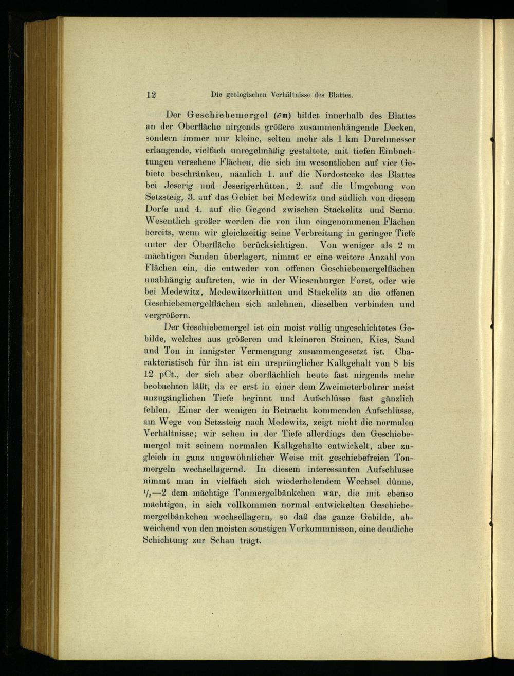 Der Geschiebemergel(öm) bildet innerhalb des Blattes an der Oberfläche nirgends größere zusammenhängende Decken, sondern immer nur kleine, selten mehr als 1 km Durehmesser erlangende, vielfach unregelmäßig gestaltete, mit tiefen Einbuchtungen versehene Flächen, die sich im wesentlichen auf vier Gebiete beschränken, nämlich 1. auf die Nordostecke des Blattes bei Jeserig und Jeserigerhütten, 2. auf die Umgebung von Setzsteig, 3. auf das Gebiet bei Medewitz und südlich von diesem Dorfe und 4. auf die Gegend zwischen Stackelitz und Serno . Wesentlich größer werden die von ihm eingenommenen Flächen bereits, wenn wir gleichzeitig seine Verbreitung in geringer Tiefe unter der Oberfläche berücksichtigen. Von weniger als 2 m mächtigen Sanden überlagert, nimmt er eine weitere Anzahl von Flächen ein, die entweder von offenen Geschiebemergelflächen unabhängig auftreten, wie in der Wiesenburger Forst, oder wie bei Medewitz, Medewitzerhütten und Stackelitz an die offenen Geschiebemergelflächen sich anlehnen, dieselben verbinden und vergrößern.|