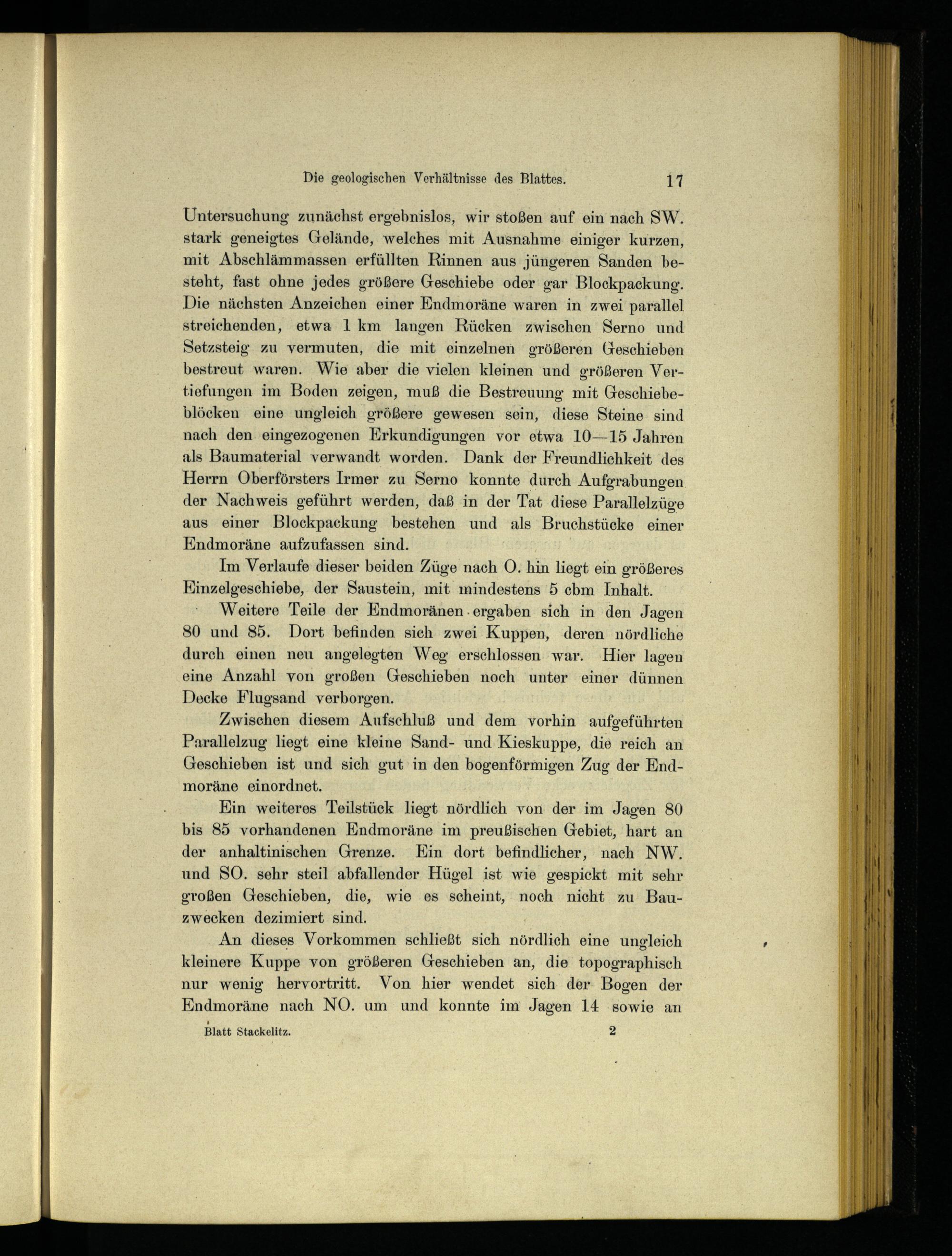 An dieses Vorkommen schließt sich nördlich eine ungleich kleinere Kuppe von größeren Geschieben an, die topographisch nur wenig hervortritt. Von hier wendet sich. der Bogen der Endmoräne nach NO. um und konnte im Jagen 14 sowie an