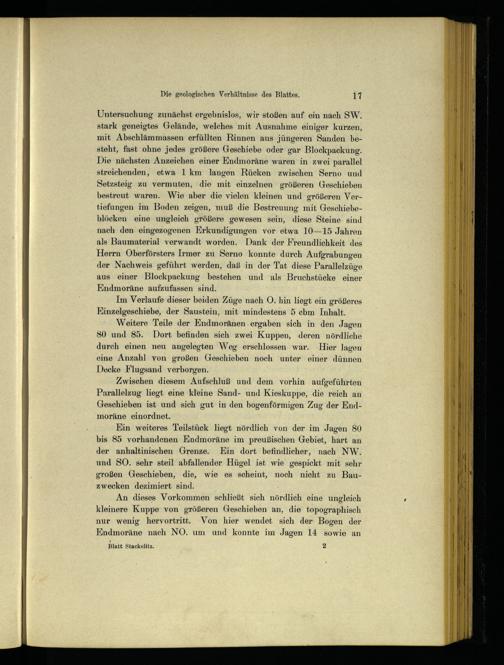 Untersuchung zunächst ergebnislos, wir stoßen auf ein nach SW. stark geneigtes Gelände, welches mit Ausnahme einiger kurzen, mit Abschlämmassen erfüllten Rinnen aus jüngeren Sanden besteht, fast ohne jedes größere Geschiebe oder gar Blockpackung. Die nächsten Anzeichen einer Endmoräne waren in zwei parallel streichenden, etwa lkm langen Rücken zwischen Serno und Setzsteig zu vermuten, die mit einzelnen größeren Geschieben bestreut waren. Wie aber die vielen kleinen und größeren Vertiefungen im Boden zeigen, muß die Bestreuung mit Geschiebeblöcken eine ungleich größere gewesen sein, diese Steine sind nach den eingezogenen Erkundigungen vor etwa 10—15 Jahren als Baumaterial verwandt worden. Dank der Freundlichkeit des Herrn Öberförsters Irmer zu Serno konnte durch Aufgrabungen der Nachweis geführt werden, daß in der Tat diese Parallelzüge aus einer Blockpackung bestehen und als Bruchstücke einer Endmoräne aufzufassen sind.