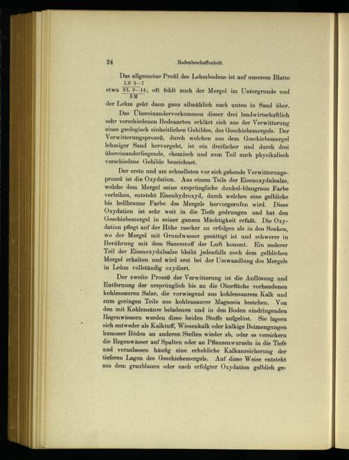 Das Übereinandervorkommen dieser drei landwirtschaftlich sehr verschiedenen Bodenarten erklärt sich aus der Verwitterung eines geologisch einheitlichen Gebildes, des Geschiebemergels. Der Verwitterungsprozeß, durch welchen aus dem Geschiebemergel lehmiger Sand hervorgeht, ist ein dreifacher und durch drei übereinanderliegende, chemisch und zum Teil auch physikalisch verschiedene Gebilde bezeichnet.