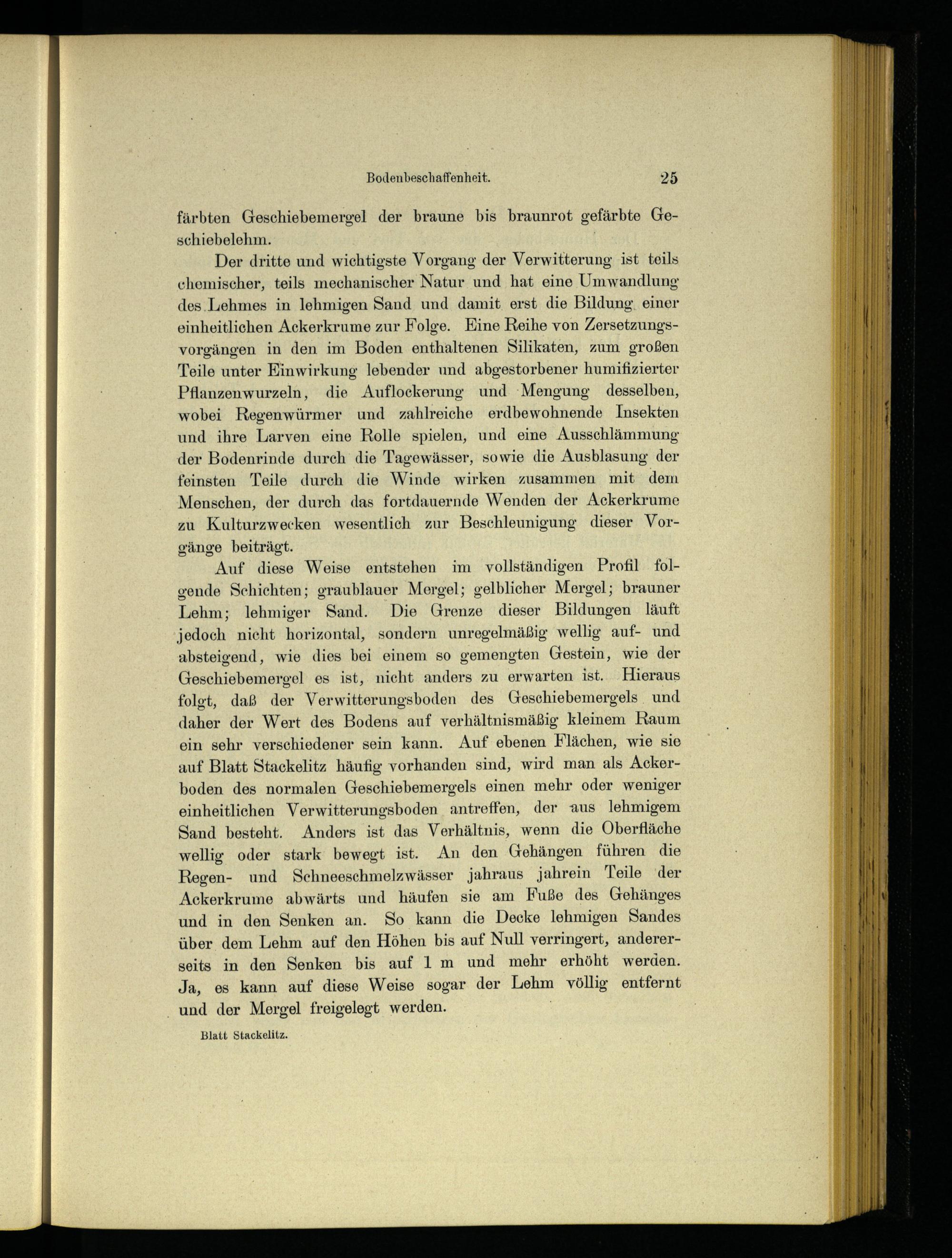 Auf diese Weise entstehen im vollständigen Profil folgende Schichten; graublauer Mergel; gelblicher Mergel; brauner Lehm; lehmiger Sand. Die Grenze dieser Bildungen läuft jedoch nicht horizontal, sondern unregelmäßig wellig auf- und absteigend, wie dies bei einem so gemengten Gestein, wie der Geschiebemergel es ist, nicht anders zu erwarten ist. Hieraus folgt, daß der Verwitterungsboden des Geschiebemergels und daher der Wert des Bodens auf verhältnismäßig kleinem Raum ein sehr verschiedener sein kann. Auf ebenen Flächen, wie sie auf Blatt Stackelitz häufig vorhanden sind, wird man als Ackerboden des normalen Geschiebemergels einen mehr oder weniger einheitlichen Verwitterungsboden antreffen, der aus lehmigem Sand besteht. Anders ist das Verhältnis, wenn die Oberfläche wellig oder stark bewegt ist. An den Gehängen führen die Regen- und Schneeschmelzwässer jahraus jahrein Teile‘der Ackerkrume abwärts und häufen sie am Fuße des Gehänges und in den Senken an. So kann die Decke lehmigen Sandes über dem Lehm auf den Höhen bis auf Null verringert, andererseits in den Senken bis auf 1 m und mehr erhöht werden. Ja, es kann auf diese Weise sogar der Lehm völlig entfernt und der Mergel freigelegt werden.
