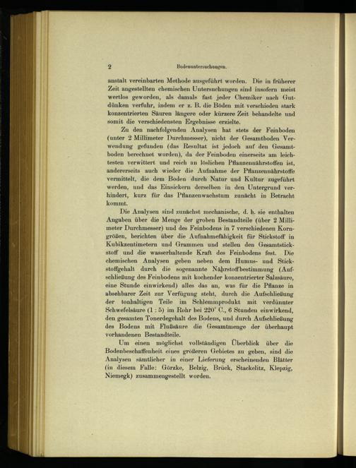 Die Analysen sind zunächst mechanische, d. h. sie enthalten Angaben über die Menge der groben Bestandteile(über 2 Millimeter Durchmesser) und des Feinbodens in 7 verschiedenen Korngrößen, berichten über die Aufnahmefähigkeit für Stickstoff in Kubikzentimetern und Grammen und stellen den Gesamtstickstoff und die wasserhaltende Kraft des Feinbodens fest. Die chemischen Analysen geben neben dem Humus- und Stickstoffgehalt durch die sogenannte Nährstoffbestimmung(Aufschließung des Feinbodens mit kochender konzentrierter Salzsäure, eine Stunde einwirkend) alles das an, was für die Pflanze in absehbarer Zeit zur Verfügung steht, durch die Aufschließung der tonhaltigen Teile im Schlemmprodukt mit verdünnter Schwefelsäure(1: 5) im Rohr bei 220° C., 6 Stunden einwirkend, den gesamten Tonerdegehalt des Bodens, und durch Aufschließung des Bodens mit Flußsäure die Gesamtmenge der überhaupt vorhandenen Bestandteile.