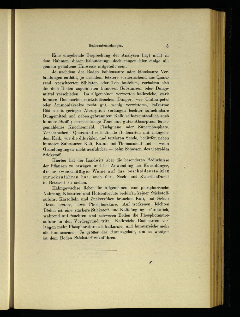 Je nachdem der Boden kohlensaure oder kieselsaure Verbindungen enthält, je nachdem letztere vorherrschend aus Quarzsand, verwitterten Silikaten oder Ton bestehen, verhalten sich die dem Boden zugeführten humosen Substanzen oder Düngemittel verschieden. Im allgemeinen verwerten kalkreiche, stark humose Bodenarten stickstoffreichen Dünger, wie Chilisalpeter oder Ammoniaksalze recht gut, wenig verwitterte, kalkarme Böden mit geringer Absorption verlangen leichter aufnehmbare Düngemittel und neben gebranntem Kalk selbstverständlich auch humose ‚Stoffe; eisenschüssige Tone mit guter Absorption feinstgemahlenes Knochenmehl, Fischguano oder Superphosphate. Vorherrschend Quarzsand enthaltende Bodenarten mit mangelndem Kalk, wie die diluvialen und tertiären Sande, bedürfen neben humosen Substanzen Kali, Kainit und Thomasmehl und— wenn Gründüngungen nicht ausführbar— beim Schossen des Getreides Stickstoff.