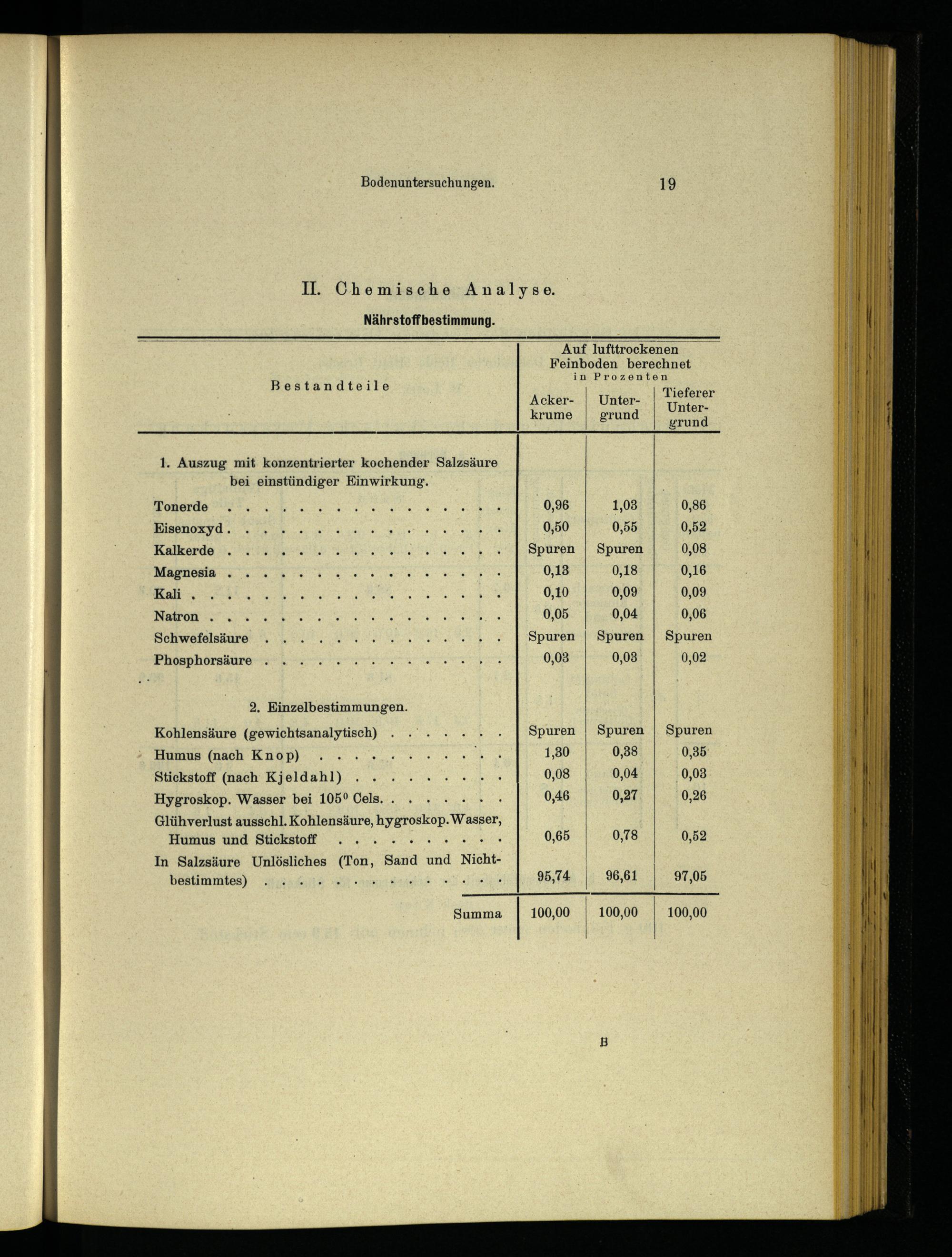 2, Einzelbestimmungen. Kohlensäure(gewichtsanalytisch) Humus(nach Knop) Stickstoff(nach Kjeldahl) Hygroskop. Wasser bei 105° Cels..