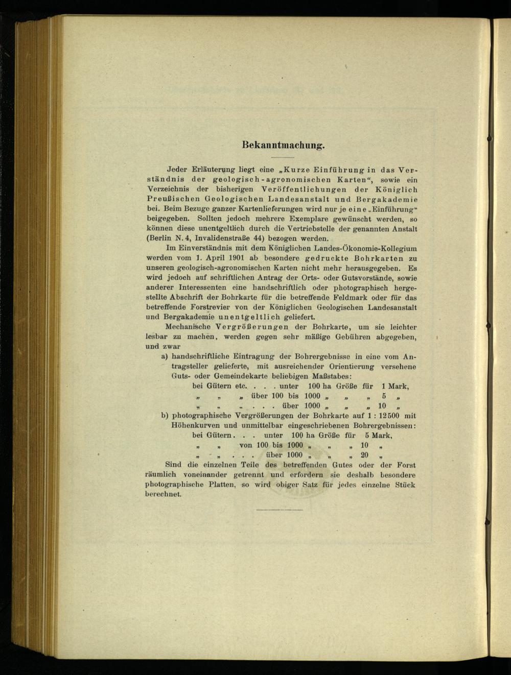Im Einverständnis mit dem Königlichen Landes-Ökonomie-Kollegium werden vom 1. April 1901 ab besondere gedruckte Bohrkarten zu unseren geologisch-agronomischen Karten nicht mehr herausgegeben. Es wird jedoch auf schriftlichen Antrag der Orts- oder Gutsvorstände, sowie anderer Interessenten eine handschriftlich oder photographisch hergestellte Abschrift der Bohrkarte für die betreffende Feldmark oder für das betreffende Forstrevier von der Königlichen Geologischen Landesanstalt und Bergakademie unentgeltlich geliefert.