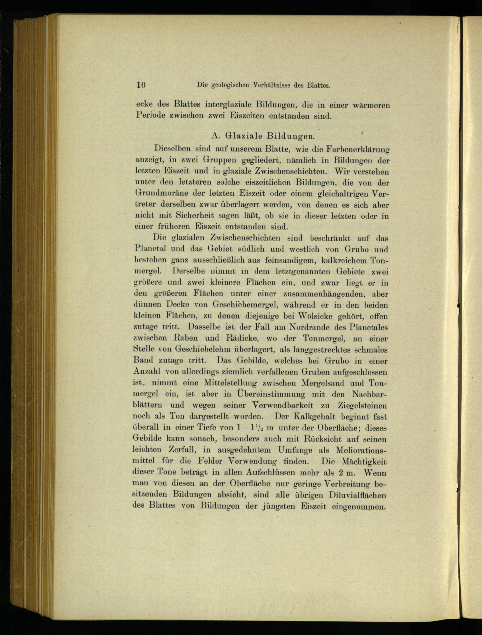 Die glazialen Zwischenschichten sind beschränkt auf das Planetal und das Gebiet südlich und westlich von Grubo und bestehen ganz ausschließlich aus feinsandigem, kalkreichem Tonmergel. Derselbe nimmt in dem letztgenannten Gebiete zwei größere und zwei kleinere Flächen ein, und zwar liegt er in den größeren Flächen unter einer zusammenhängenden, aber dünnen Decke von Geschiebemergel, während er in den beiden kleinen Flächen, zu denen diejenige bei Wölsicke gehört, offen zutage tritt. Dasselbe ist der Fall am Nordrande des Planetales zwischen Raben und Rädicke, wo der Tonmergel, an einer Stelle von Geschiebelehm überlagert, als lanygestrecktes schmales Band zutage tritt. Das Gebilde, welches bei Grubo in einer Anzahl von allerdings ziemlich verfallenen Gruben aufgeschlossen ist, nimmt eine Mittelstellung zwischen Mergelsand und Tonmergel ein, ist aber in Übereinstimmung mit den Nachbarblättern und wegen seiner Verwendbarkeit zu Ziegelsteinen noch als Ton dargestellt worden. Der Kalkgehalt‘ beginnt fast überall in einer Tiefe von 1—1'/; m unter der Oberfläche; dieses Gebilde kann sonach, besonders auch mit Rücksicht auf seinen leichten Zerfall, in ausgedehntem Umfange als Meliorationsmittel für die Felder Verwendung finden. Die Mächtigkeit dieser Tone beträgt in allen Aufschlüssen mehr als 2m. Wenn man von diesen an der Oberfläche nur geringe Verbreitung besitzenden Bildungen absieht, sind alle übrigen Diluvialflächen des Blattes von Bildungen der jüngsten Eiszeit eingenommen.