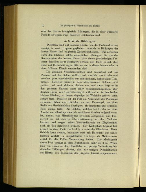 Dieselben sind auf unserem Blatte, wie die Farbenerklärung anzeigt, in zwei Gruppen gegliedert, nämlich in Bildungen der letzten Eiszeit und in glaziale Zwischenschichten. Wir verstehen unter den letzteren solche eiszeitlichen Bildungen, die von der Grundmoräne der letzten Eiszeit oder einem gleichaltrigen Vertreter derselben zwar überlagert werden, von denen es sich aber nicht mit Sicherheit sagen läßt, ob sie in dieser letzten oder in einer früheren Eiszeit entstanden sind.