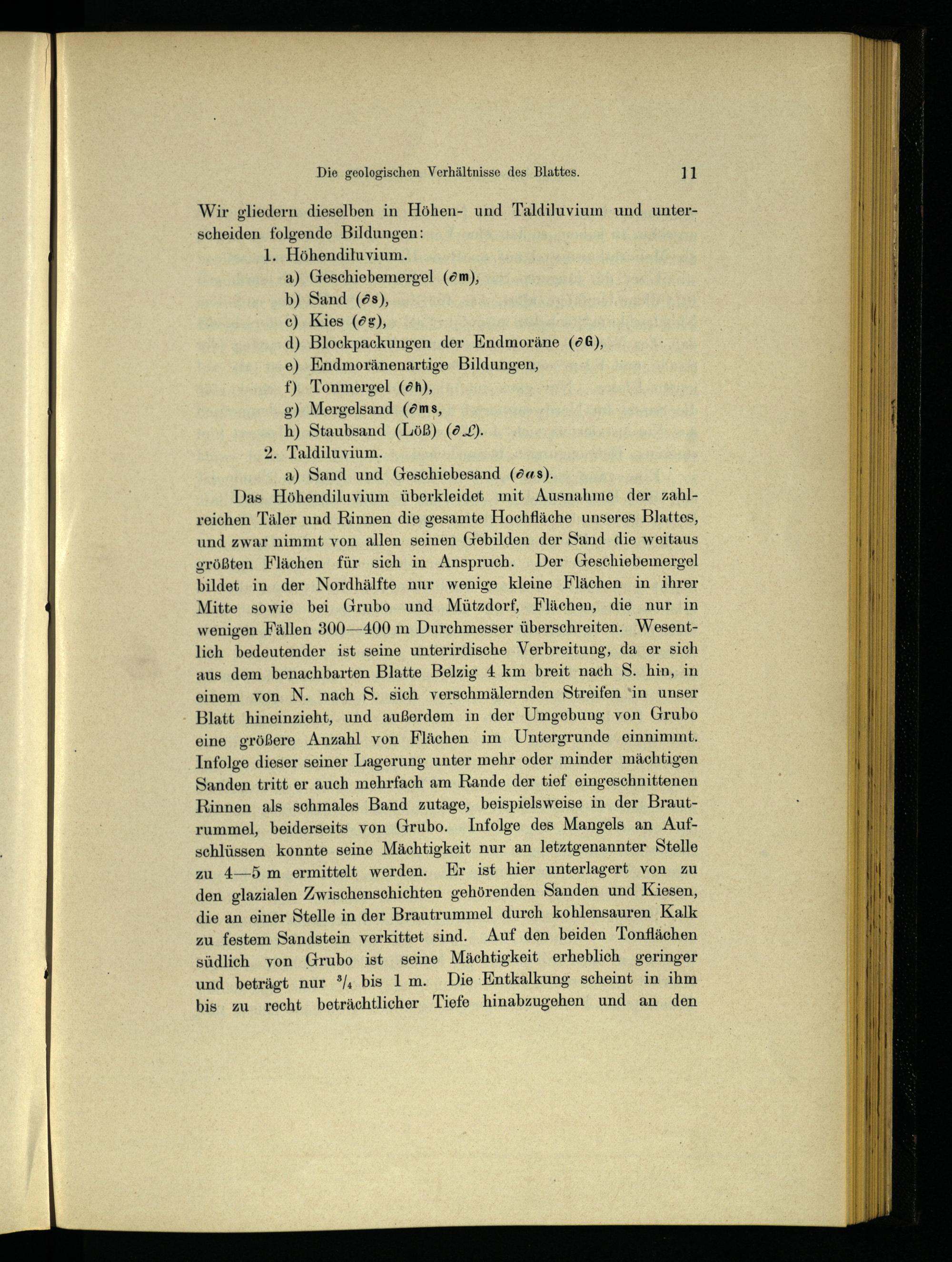 Wir gliedern dieselben in Höhen- und Taldiluvium und unterscheiden folgende Bildungen: 1. Höhendihuvium. a) Geschiebemergel(0m), b) Sand(ös), c) Kies(68), d) Blockpackungen der Endmoräne(66), e) Endmoränenartige Bildungen, f) Tonmergel(öh), g) Mergelsand(öms, h) Staubsand(Löß)(0.L). 2. Taldiluvium. a) Sand und Geschiebesand(ö«5).