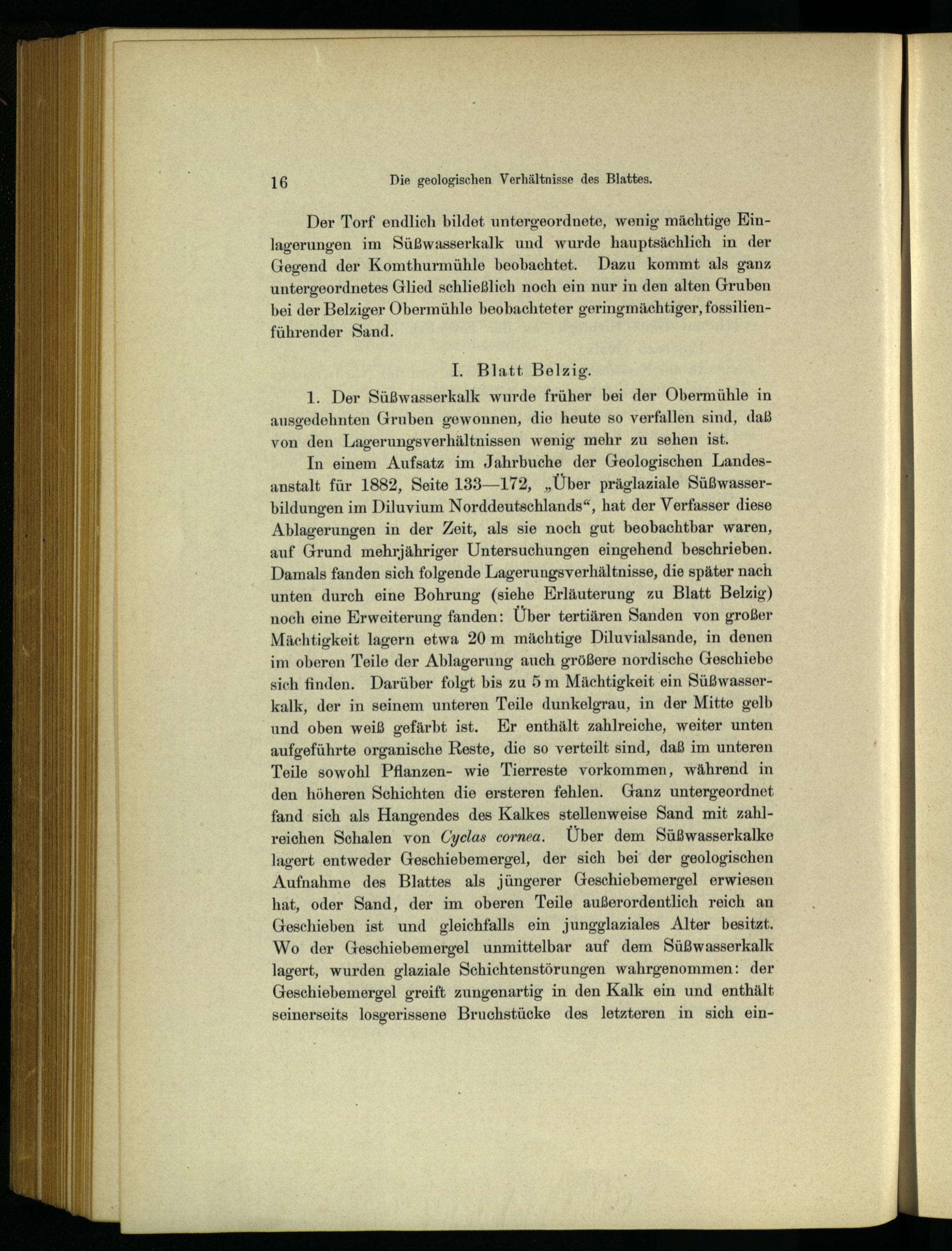 In einem Aufsatz im Jahrbuche der Geologischen Landesanstalt für 1882, Seite 133—172,„Über präglaziale Süßwasserbildungen im Diluvium Norddeutschlands“, hat der Verfasser diese Ablagerungen in der Zeit, als sie noch gut beobachtbar waren, auf Grund mehrjähriger Untersuchungen eingehend beschrieben. Damals fanden sich folgende Lagerungsverhältnisse, die später nach unten durch eine Bohrung(siehe Erläuterung zu Blatt Belzig ) noch eine Erweiterung fanden: Über tertiären Sanden von großer Mächtigkeit lagern etwa 20m mächtige Diluvialsande, in denen im oberen Teile der Ablagerung auch größere nordische Geschiebe sich finden. Darüber folgt bis zu 5m Mächtigkeit ein Süßwasserkalk, der in seinem unteren Teile dunkelgrau, in der Mitte gelb und oben weiß gefärbt ist. Er enthält zahlreiche, weiter unten aufgeführte organische Reste, die so verteilt sind, daß im unteren Teile sowohl Pflanzen- wie Tierreste vorkommen, während in den höheren Schichten die ersteren fehlen. Ganz untergeordnet fand sich als Hangendes des Kalkes stellenweise Sand mit zahlreichen Schalen von Cyclas cornea. Über dem Süßwasserkalke lagert entweder Geschiebemergel, der sich bei der geologischen Aufnahme des Blattes als jüngerer Geschiebemergel erwiesen hat, oder Sand, der im oberen Teile außerordentlich reich an Geschieben ist und gleichfalls ein jungglaziales Alter besitzt. Wo der Geschiebemergel unmittelbar auf dem Süßwasserkalk lagert, wurden glaziale Schichtenstörungen wahrgenommen: der Geschiebemergel greift zungenartig in den Kalk ein und enthält seinerseits losgerissene Bruchstücke des letzteren in sich ein