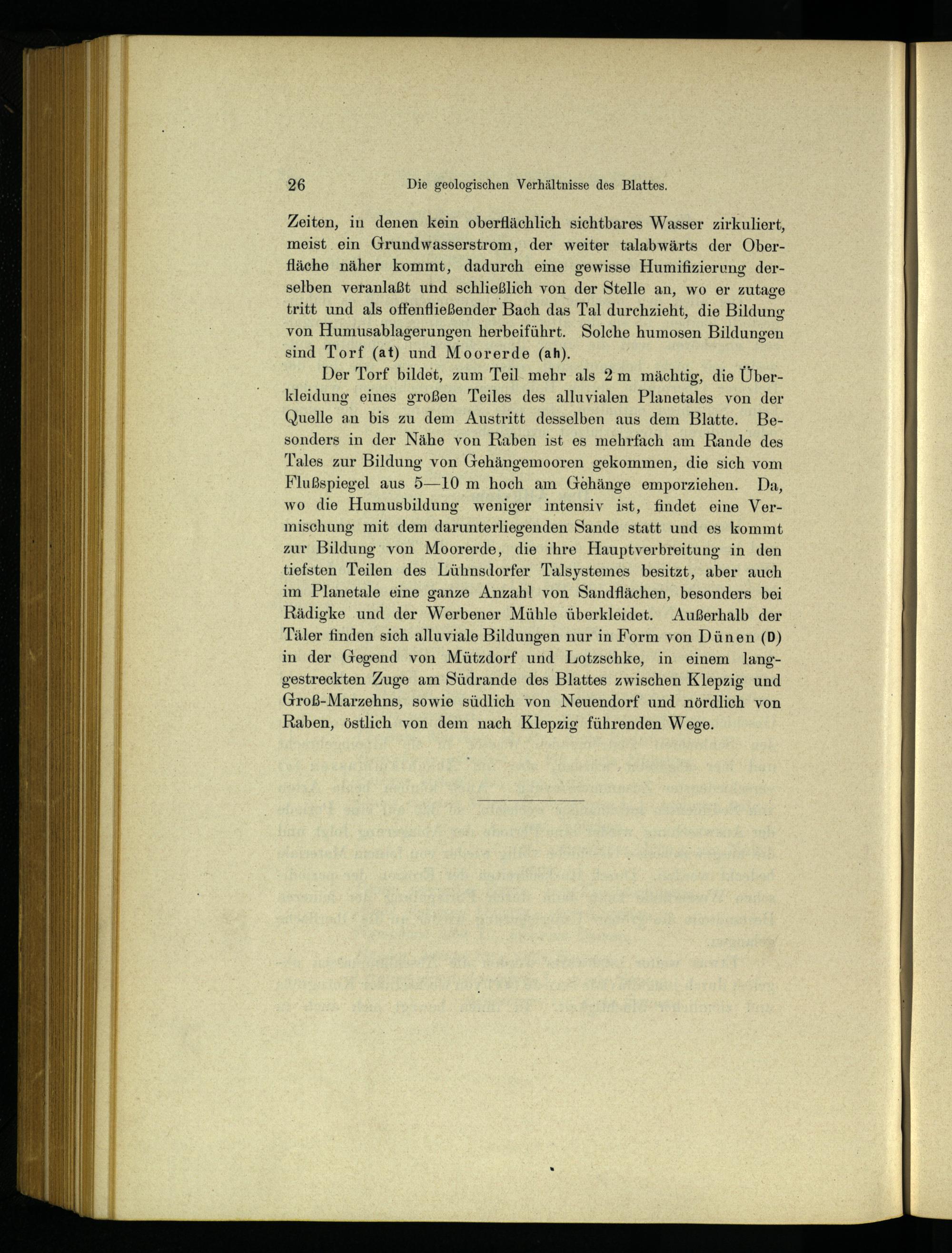 Der Torf bildet, zum Teil. mehr als 2m mächtig, die Überkleidung eines großen Teiles des alluvialen Planetales von der Quelle an bis zu dem Austritt desselben aus dem Blatte. Besonders in der Nähe von Raben ist es mehrfach am Rande des Tales zur Bildung von Gehängemooren gekommen, die sich vom Flußspiegel aus 5—10 m hoch am Gehänge emporziehen. Da, wo die Humusbildung weniger intensiv ist, findet eine Vermischung mit dem darunterliegenden Sande statt und es kommt zur Bildung‘ von Moorerde, die ihre Hauptverbreitung in den tiefsten Teilen des Lühnsdorfer Talsystemes besitzt, aber auch im Planetale eine ganze Anzahl von Sandflächen, besonders bei Rädigke und der Werbener Mühle überkleidet. Außerhalb der Täler finden sich alluviale Bildungen nur in Form von Dünen(D) in der Gegend von Mützdorf und Lotzschke, in einem langgestreckten Zuge am Südrande des Blattes zwischen Klepzig und Groß-Marzehns, sowie südlich von Neuendorf und nördlich von Raben, östlich von dem nach Klepzig führenden Wege.