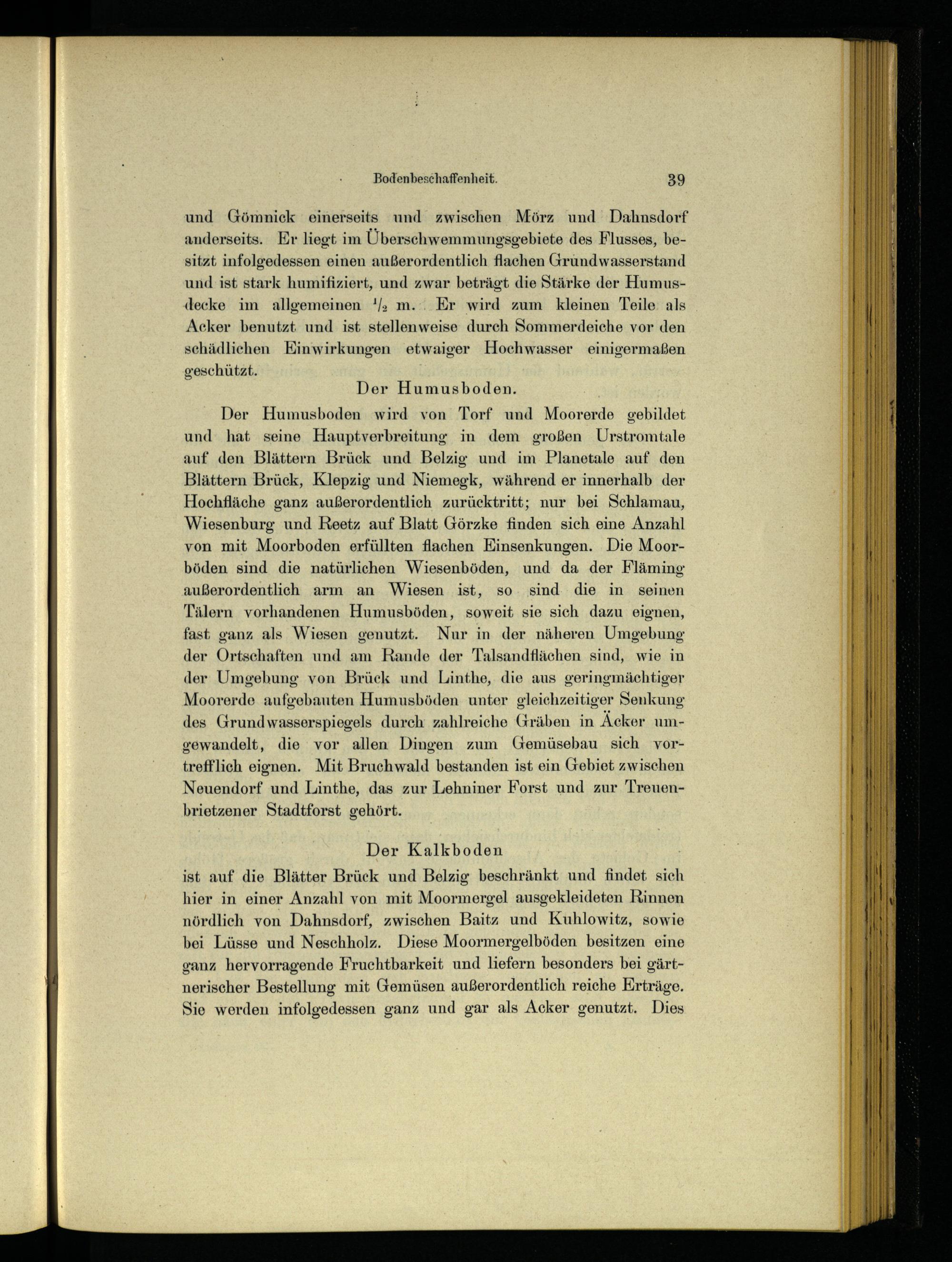 und Gömnick einerseits und zwischen Mörz und Dahnsdorf anderseits. Er liegt im Überschwemmungsgebiete des Flusses, besitzt infolgedessen einen außerordentlich flachen Grundwasserstand und ist stark humifiziert, und zwar beträgt die Stärke der Humusdecke im allgemeinen!/» m.:. Er wird zum kleinen Teile: als Acker benutzt und ist stellenweise durch Sommerdeiche vor den schädlichen Einwirkungen etwaiger Hochwasser einigermaßen geschützt. Der Humusboden.