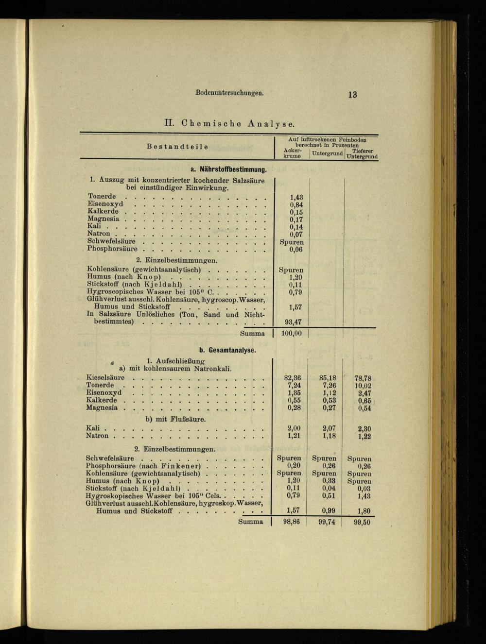 Kohlensäure(gewichtsanalytisch)....... Spuren| Humus(nach Knop). N 1,20 Stickstoff(nach Kjeldahl) ne a 0,11 Hygroscopisches Wasser bei 105° Ce 0,79 Glühverlust ausschl. Kohlensäure, hygroscop. Wasser,