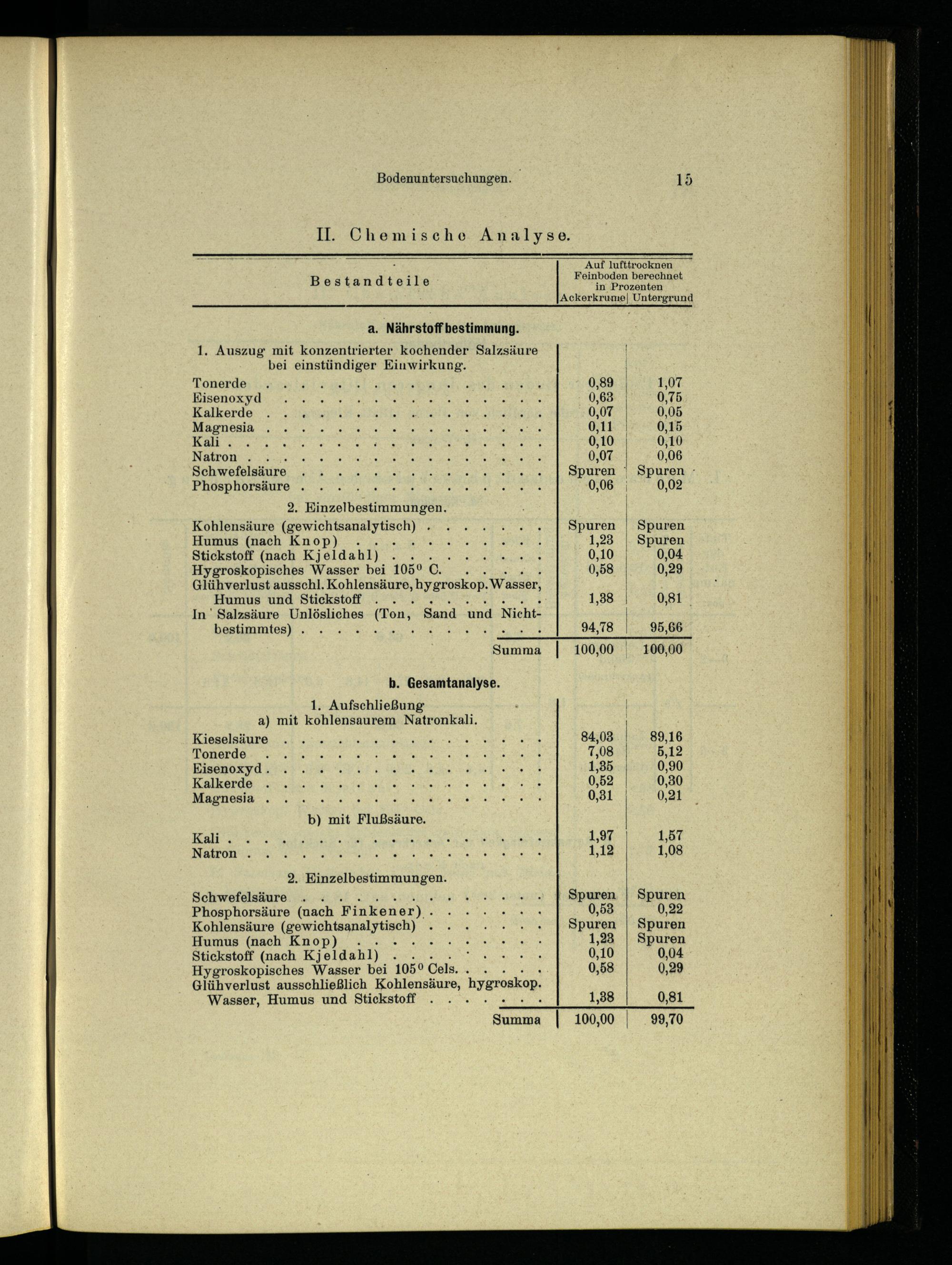 Kohlensäure(gewichtsanalytisch)...... Spuren| Spuren Humus(nach Knop)-. A 1,23. Spuren Stickstoff(nach Kjeldahl).. U Delete 0,10 0,04 Hygroskopisches Wasser bei 105° 6. 0,58 0,29 Glühverlust ausschl. Kohlensäure, hygroskop. Wasser,