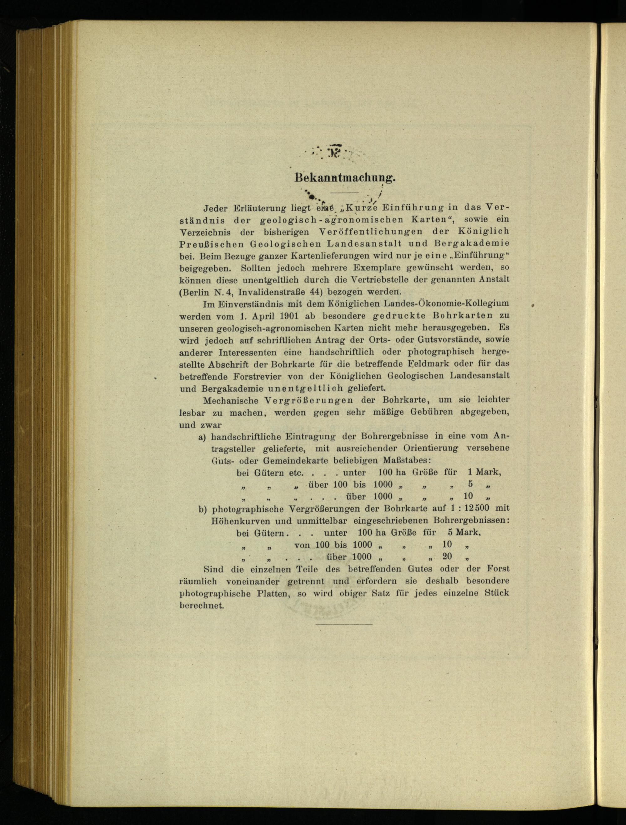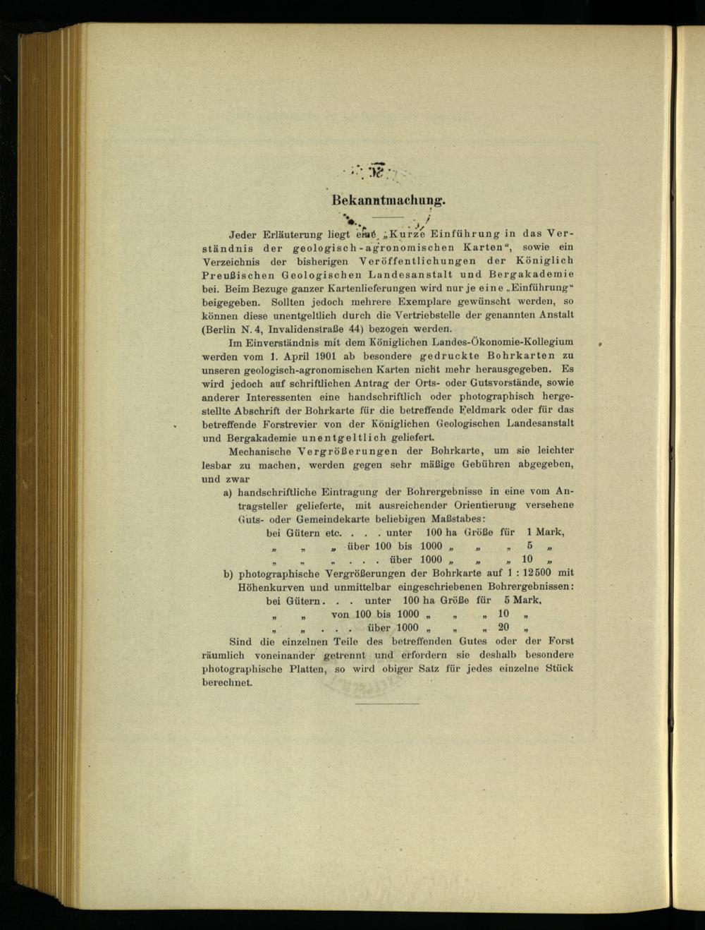 Im Einverständnis mit dem Königlichen Landes-Ökonomie-Kollegium werden vom 1. April 1901 ab besondere gedruckte Bohrkarten zu unseren geologisch-agronomischen Karten nicht mehr herausgegeben. Es wird jedoch auf schriftlichen Antrag der Orts- oder Gutsvorstände, sowie anderer Interessenten eine handschriftlich oder photographisch hergestellte Abschrift der Bohrkarte für die betreffende Feldmark oder für das betreffende Forstrevier von der Königlichen Geologischen Landesanstalt und Bergakademie unentgeltlich geliefert.
