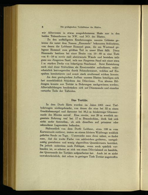 Zu den auffälligsten Erscheinungen unseres Gebietes gehören die unter dem Namen„Rummeln“ bekannten Schluchten, von denen die Lobbeser Rummel ganz, die am Westrand gelegene Rummel zum größten Teil in unser Blatt fällt. Diese Rummeln besitzen bei einer Breite von 10—60 m eine Tiefe von 6—10 m sowie steil abstürzende Wände und bestehen teils ganz aus Jüngerem Sand, teils aus Jüngerem Sand mit einer etwa 1 m starken Decke von lößartigem Staubsand. Ihrer Entstehung nach sind diese Schluchten als Erosionstäler aufzufassen, wahrscheinlich hervorgerufen durch Schmelzwasser, welches auf Eisspalten herabstürzte und somit stark erodierend wirken konnte.