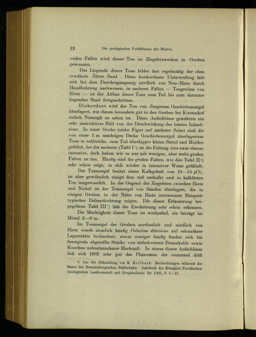 Der Tonmergel besitzt einen Kalkgehalt von 10—15 pCt., ist aber gewöhnlich einige dem tief entkalkt und in kalkfreien Ton umgewandelt. In der Gegend der Ziegeleien zwischen Rietz und Nichel ist der Tonmergel von Sanden überlagert, die in einigen Gruben in der Nähe von Rietz interessante Beispiele typischer Deltaschichtung zeigen. Die dieser Erläuterung beigegebene Tafel III') 1äßt die Eirscheinung sehr schön erkennen.