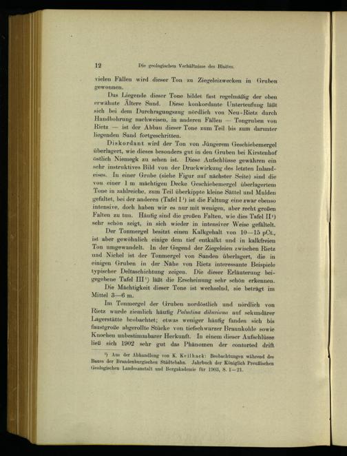 Diskordant wird der Ton von Jüngerem Geschiebemergel überlagert, wie dieses besonders gut in den Gruben bei Kirstenhof östlich Niemegk zu sehen ist. Diese Aufschlüsse gewähren ein sehr instruktives Bild von der Druckwirkung des Jetzten Inlandeises. In einer Grube(siehe Figur auf nächster Seite) sind die von einer 1 m mächtigen Decke Geschiebemergel überlagertem Tone in zahlreiche, zum Teil überkippte kleine Sättel und Mulden gefaltet, bei der anderen(Tafel 1’) ist die Faltung eine zwar ebenso intensive, doch haben wir es nur mit wenigen, aber recht großen Falten zu tun. Häufig sind die großen Falten, wie dies"Tafel I1I:) sehr schön zeigt, in sich wieder in intensiver Weise gefältelt.