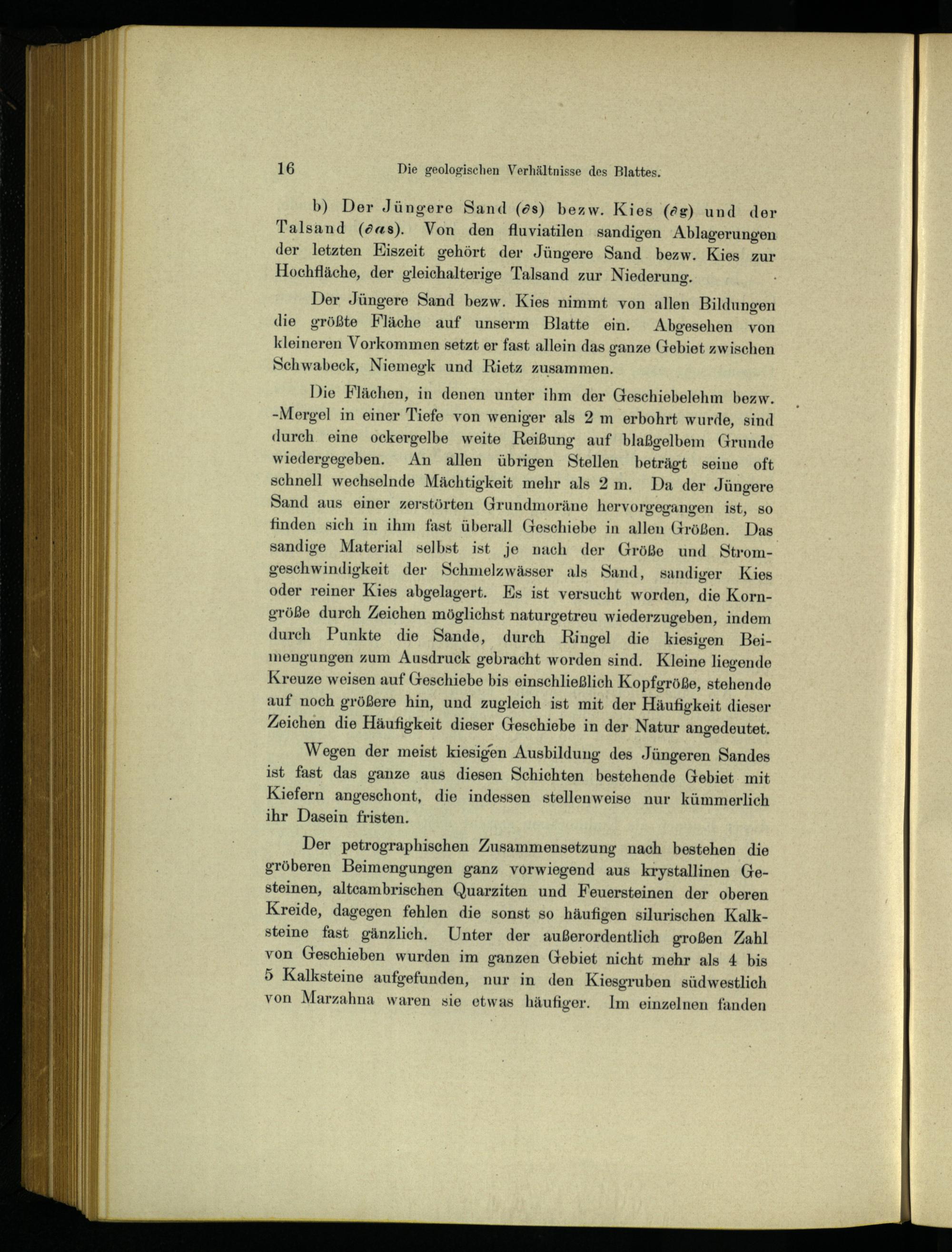 Die Flächen, in denen unter ihm der Geschiebelehm bezw. -Mergel in einer Tiefe von weniger als 2 m erbohrt wurde, sind durch eine ockergelbe weite Reißung auf blaßgelbem Grunde wiedergegeben. An allen übrigen Stellen beträgt seine oft schnell wechselnde Mächtigkeit mehr als 2m. Da der Jüngere Sand aus einer zerstörten Grundmoräne hervorgegangen ist, so finden sich in ihm fast überall Geschiebe in allen Größen. Das sandige Material selbst ist je nach der Größe und Stromgeschwindigkeit der Schmelzwässer als Sand, sandiger Kies oder reiner Kies abgelagert. Es ist versucht worden, die Korngröße durch Zeichen möglichst naturgetreu wiederzugeben, indem durch Punkte die Sande, durch Ringel die kiesigen Beimengungen zum Ausdruck gebracht worden sind. Kleine liegende Kreuze weisen auf Geschiebe bis einschließlich Kopfgröße, stehende auf noch größere hin, und zugleich ist mit der Häufigkeit dieser Zeichen die Häufigkeit dieser Geschiebe in der Natur angedeutet.