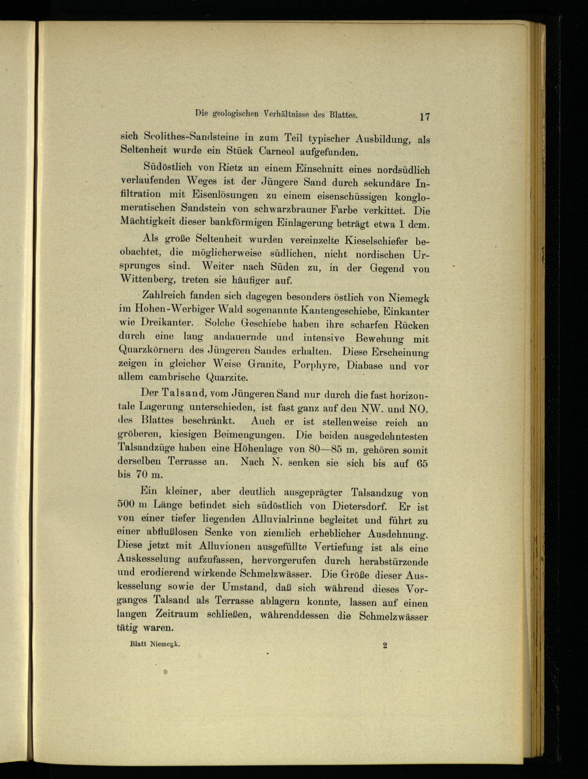 : Zahlreich fanden sich dagegen besonders östlich von Niemegk im Hohen-Werbiger Wald sogenannte Kantengeschiebe, Einkanter wie Dreikanter.. Solche Geschiebe haben ihre scharfen Rücken durch eine lang andauernde und. intensive Bewehung mit Quarzkörnern des Jüngeren Sandes erhalten. Diese Erscheinung zeigen in gleicher Weise Granite , Porphyre, Diabase und vor allem cambrische Quarzite.