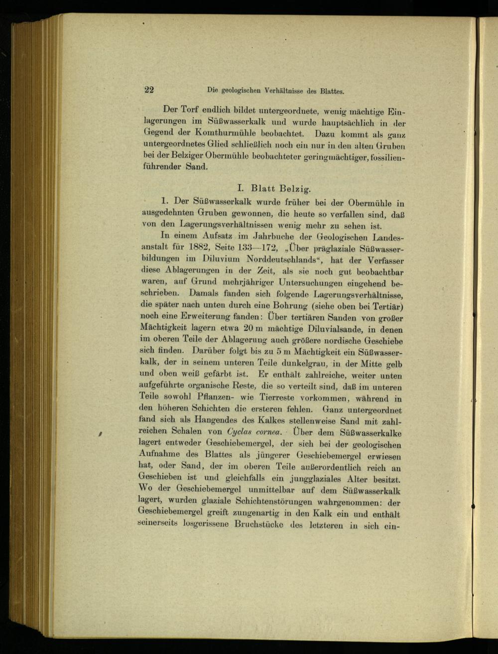 In einem Aufsatz im Jahrbuche der Geologischen Landesanstalt für 1882, Seite 133—172,„Über präglaziale Süßwasserbildungen im Diluvium Norddeutsehlands“, hat der Verfasser diese Ablagerungen in der Zeit, als sie noch gut beobachtbar waren, auf Grund mehrjähriger Untersuchungen eingehend beschrieben. Damals fanden sich folgende Lagerungsverhältnisse, die später nach unten durch eine Bohrung(siehe oben bei Tertiär) noch eine Erweiterung fanden: Über tertiären Sanden von großer Mächtigkeit lagern etwa 20m mächtige Diluvialsande, in denen im oberen Teile der Ablagerung auch größere nordische Geschiebe sich finden. Darüber folgt bis zu 5 m Mächtigkeit ein Süßwasserkalk, der in seinem unteren Teile dunkelgrau, in der Mitte gelb und oben weiß gefärbt ist. Er enthält zahlreiche, weiter unten aufgeführte organische Reste, die so verteilt sind, daß im unteren Teile sowohl Pflanzen- wie Tierreste vorkommen, während in den höheren Schichten die ersteren fehlen. Ganz untergeordnet fand sich als Hangendes des Kalkes stellenweise Sand mit zahlreichen Schalen von Cyclas cornea.: Über dem Süßwasserkalke lagert entweder Geschiebemergel, der sich bei der geologischen Aufnahme des Blattes als jüngerer Geschiebemergel erwiesen hat, oder Sand, der im oberen Teile außerordentlich reich an Geschieben ist und gleichfalls ein jJungglaziales Alter besitzt. Wo der Geschiebemergel unmittelbar auf dem Süßwasserkalk lagert, wurden glaziale Schichtenstörungen wahrgenommen: der Geschiebemergel greift zungenartig in den Kalk ein und enthält seinerseits losgerissene Bruchstücke des letzteren in sich ein
