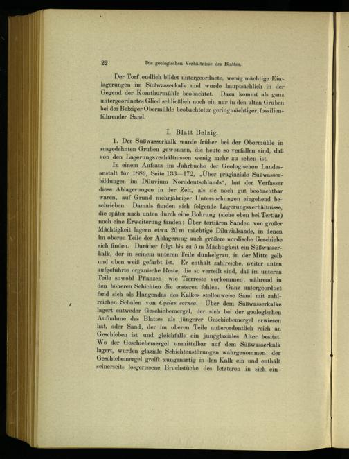 Der Torf endlich bildet untergeordnete, wenig mächtige Einlagerungen im Süßwasserkalk und wurde hauptsächlich in der Gegend der Komthurmühle beobachtet. Dazu kommt als ganz untergeordnetes Glied schließlich noch ein nur in den alten Gruben bei der Belziger Obermühle beobachteter geringmächtiger, fossilienführender Sand.