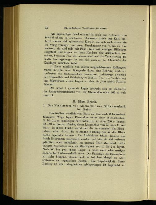 Als eigenartiges Vorkommen ‚ist noch das Auftreten von Strudellöchern zu erwähnen. Senkrecht durch den Kalk hindurch ziehen sich zylindrische Körper, die sich nach unten hin ein wenig verengen und einen Durchmesser von!/4 bis zu 1 m besitzen; sie sind teils mit Sand, teils mit lehmigen Bildungen ausgefüllt und tragen an ihren Rändern eine Auskleidung von zähem, braunem Ton, der anscheinend aus der Verwitterung des Kalks hervorgegangen ist und sich auch an der Oberfläche der Kalklager mehrfach findet.