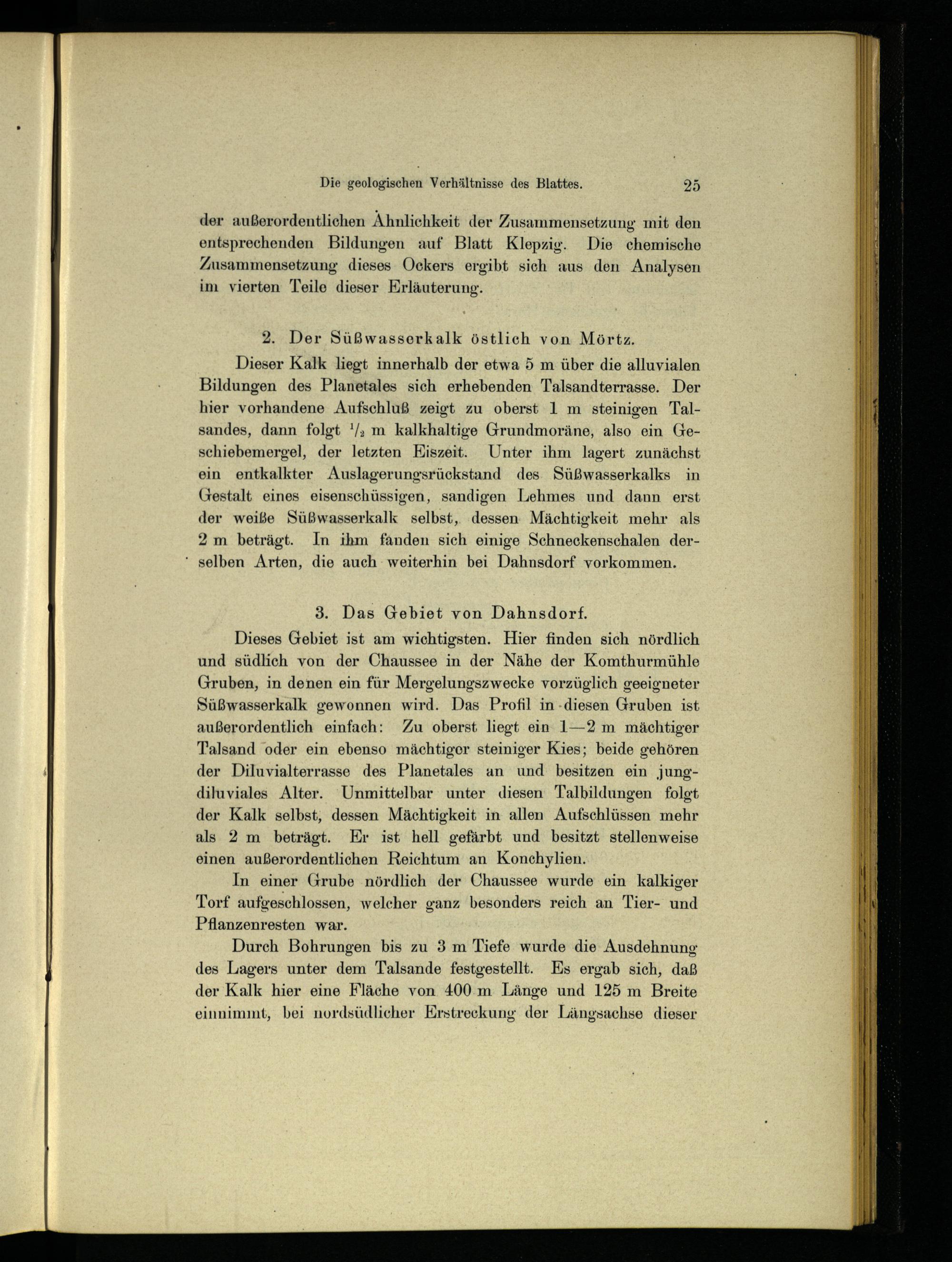 Dieses Gebiet ist am wichtigsten. Hier finden sich nördlich und südlich von der Chaussee in der Nähe der Komthurmühle Gruben, in denen ein für Mergelungszwecke vorzüglich geeigneter Süßwasserkalk gewonnen wird. Das Profil in-diesen Gruben ist außerordentlich einfach: Zu oberst liegt ein 1—2 m mächtiger Talsand oder ein ebenso mächtiger steiniger Kies; beide gehören der Diluvialterrasse des Planetales an und besitzen ein jungdiluviales Alter. Unmittelbar unter diesen Talbildungen folgt der Kalk selbst; dessen Mächtigkeit in allen Aufschlüssen mehr als 2 m beträgt. Er ist hell gefärbt und besitzt stellenweise einen außerordentlichen Reichtum an Konchylien.
