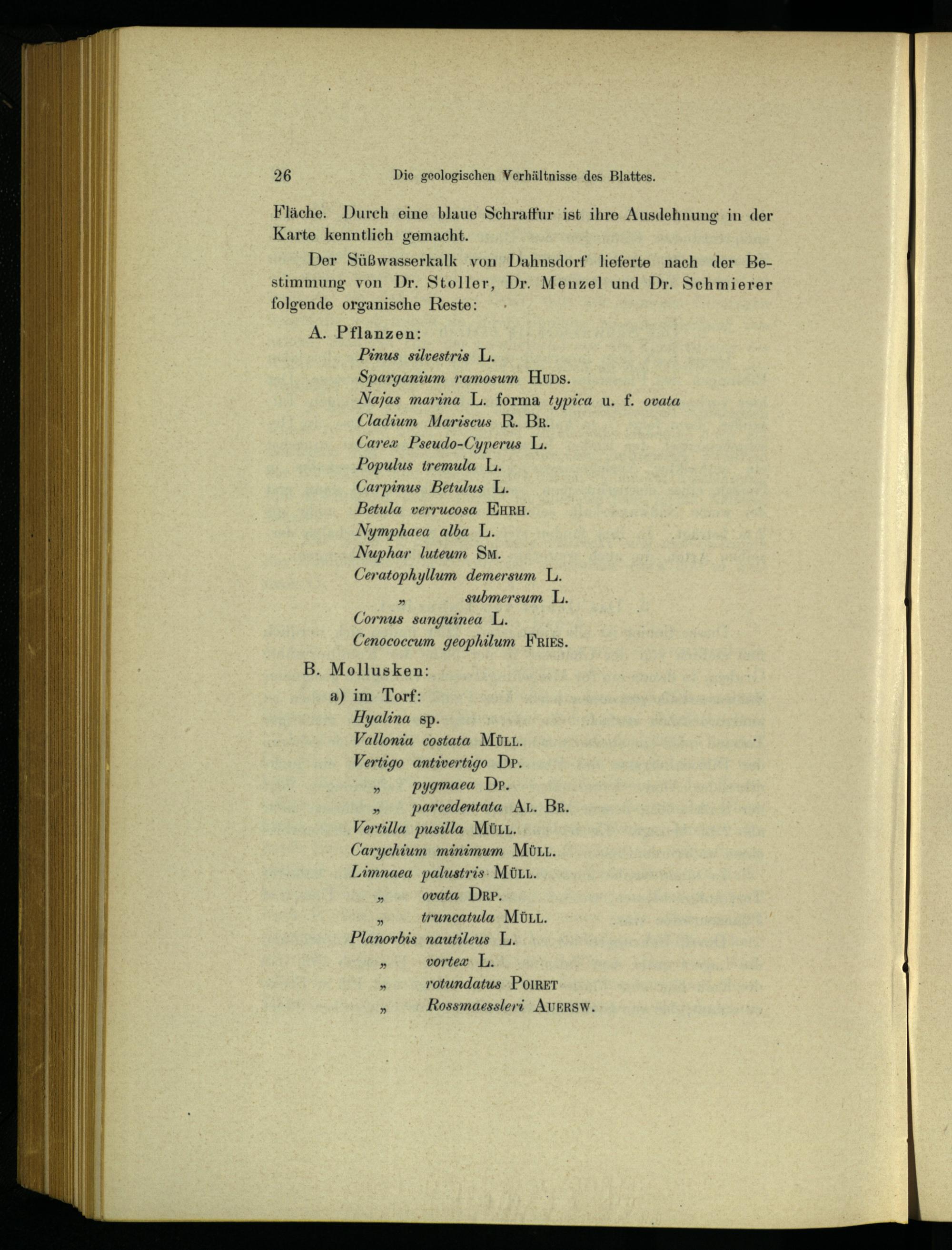 Der Süßwasserkalk von Dahnsdorf lieferte nach der Bestimmung von Dr. Stoller, Dr. Menzel und Dr. Schmierer folgende organische Reste: