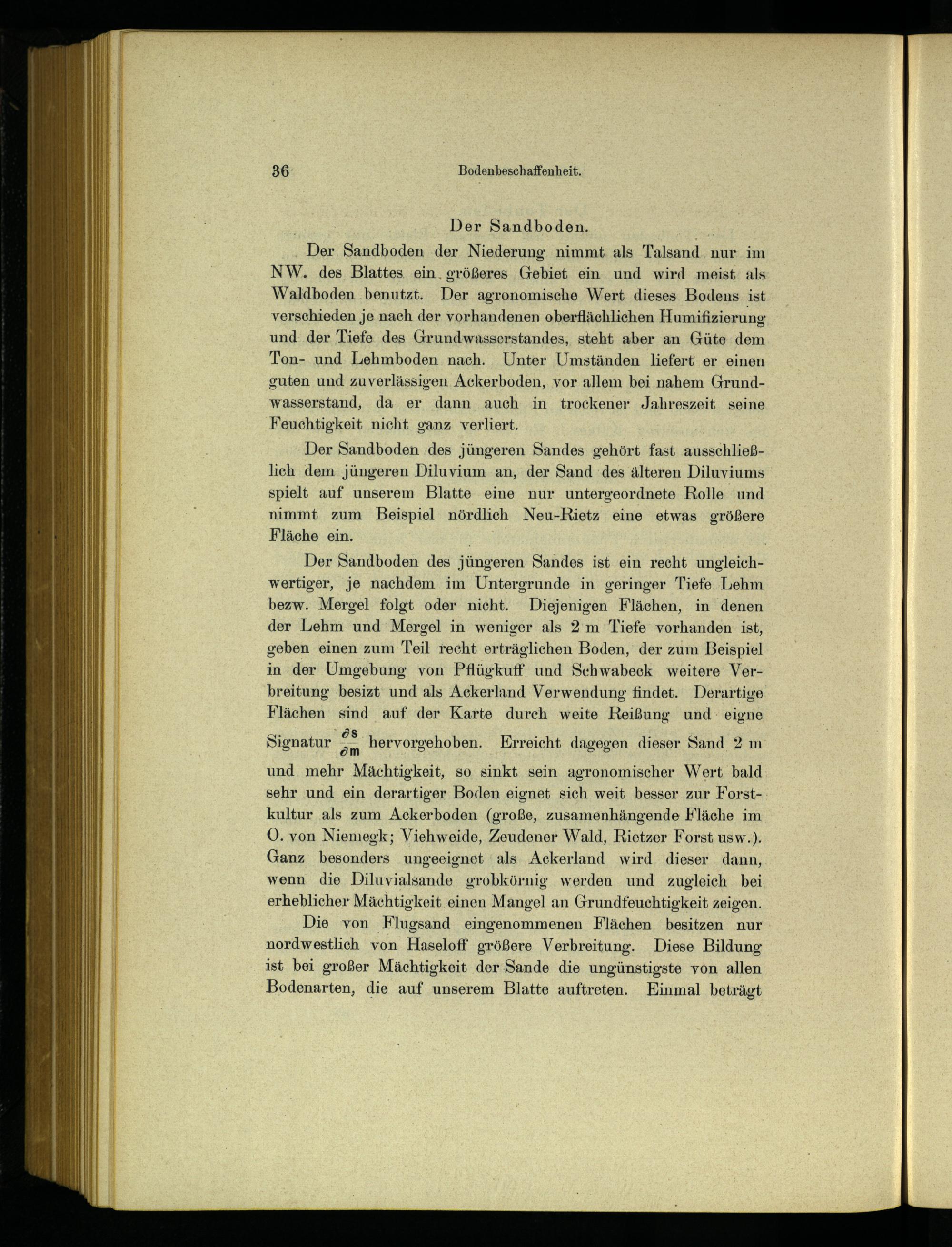 Der Sandboden ‚des jüngeren Sandes gehört fast ausschließlich dem jüngeren Diluvium an, der Sand ‚des älteren Diluviums spielt auf unserem Blatte eine nur untergeordnete Rolle und nimmt zum Beispiel nördlich Neu-Rietz eine etwas größere Fläche ein.;;