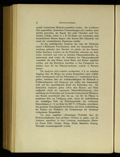 Die Analysen sind zunächst mechanische, d. h. sie enthalten Angaben über die Menge der groben Bestandteile(über 2 Millimeter Durchmesser) und des Feinbodens in 7 verschiedenen Korngrößen, berichten über die Aufnahmefähigkeit für Stickstoff in Kubikzentimetern und Grammen und stellen den Gesamtstickstoff und die wasserhaltende Kraft des Feinbodens fest. Die chemischen Analysen geben neben dem Humus- und Stickstoffgehalt durch die sogenannte Nährstoffbestimmung(Aufschließung des Feinbodens mit kochender konzentrierter Salzsäure, eine Stunde einwirkend) alles das an, was für die Pflanze in absehbarer Zeit zur Verfügung steht, durch die Aufschließung der tonhaltigen Teile im Schlemmprodukt mit verdünnter Schwefelsäure(1: 5) im Rohr bei 220° C., 6 Stunden einwirkend, den gesamten Tonerdegehalt des Bodens, und durch Aufschließung des Bodens mit Flußsäure die Gesamtmenge der überhaupt vorhandenen Bestandteile.