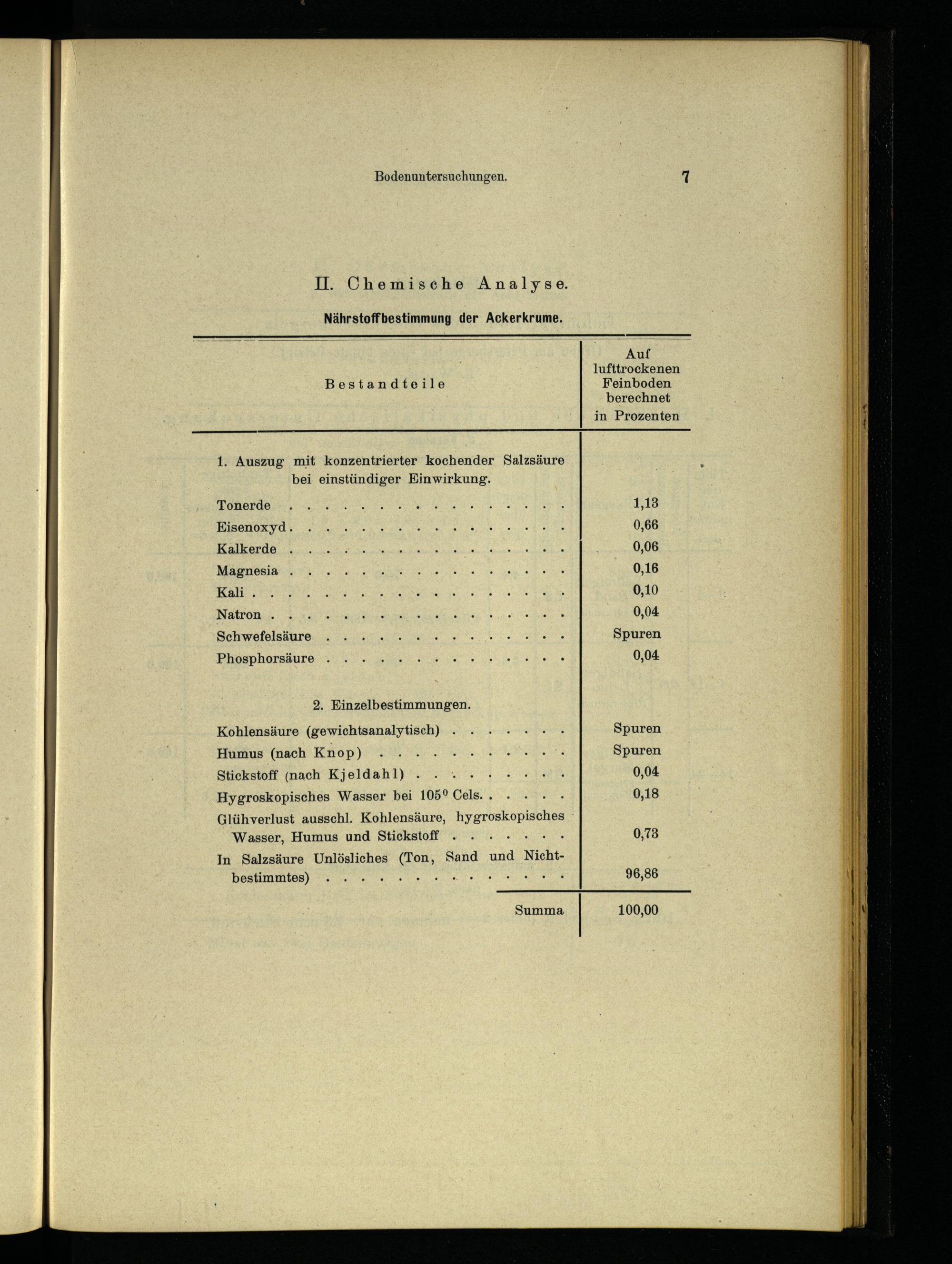 Kohlensäure(gewichtsanalytisch)....++ Spuren Humus(nach Knop) KLAR Spuren Stickstoff(nach Kjeldahl): 4.00.04 0,04 Hygroskopisches Wasser bei 105° Cels..... 0,18