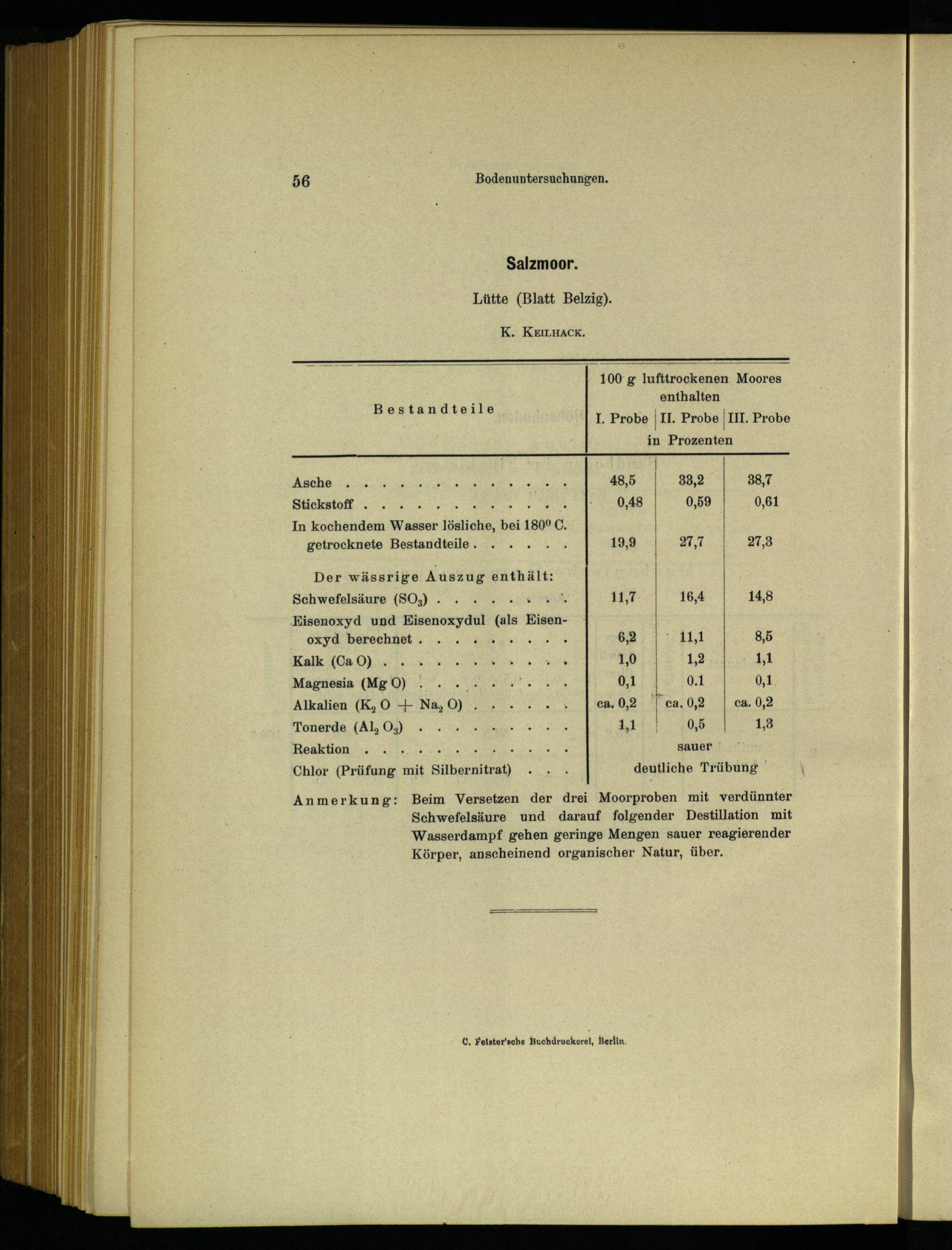 Anmerkung: Beim Versetzen der drei Moorproben mit verdünnter Schwefelsäure und darauf folgender Destillation mit Wasserdampf gehen geringe Mengen sauer reagierender Körper, anscheinend organischer Natur, über,