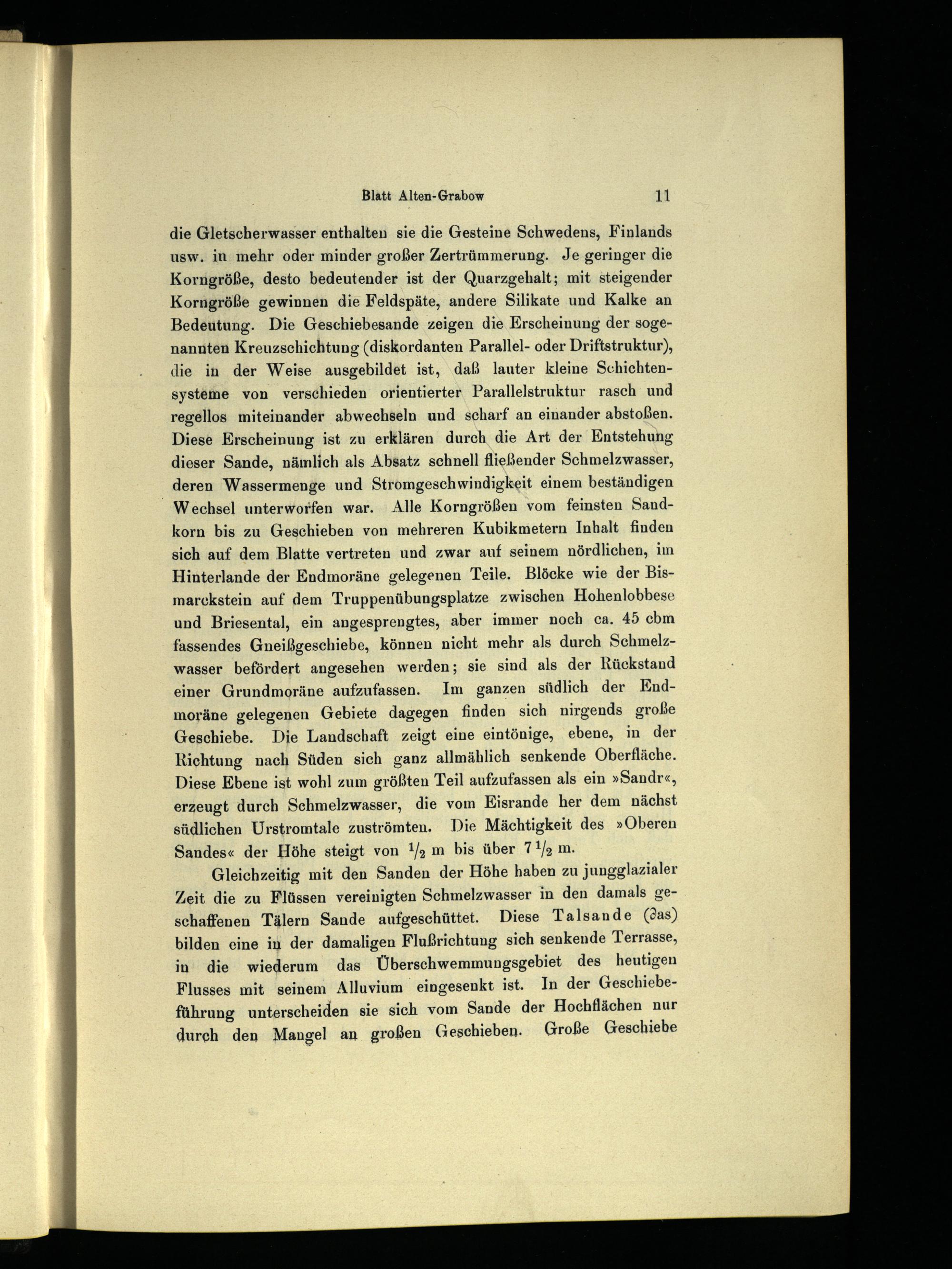 die Gletscherwasser enthalten sie die Gesteine Schwedens , Finlands usw. in mehr oder minder großer Zertrümmerung. Je geringer die Korngröße, desto bedeutender ist der Quarzgehalt; mit steigender Korngröße gewinnen die Feldspäte, andere Silikate und Kalke an Bedeutung. Die Geschiebesande zeigen die Erscheinung der sogenannten Kreuzschichtung(diskordanten Parallel- oder Driftstruktur), die in der Weise ausgebildet ist, daß lauter kleine Schichtensysteme von verschieden orientierter Parallelstruktur rasch und regellos miteinander abwechseln und scharf an einander abstoßen. Diese Erscheinung ist zu erklären durch die Art der Entstehung dieser Sande, nämlich als Absatz schnell fließender Schmelzwasser, deren Wassermenge und Stromgeschwindigkeit einem beständigen Wechsel unterworfen war. Alle Korngrößen vom feinsten Sandkorn bis zu Geschieben von mehreren Kubikmetern Inhalt finden sich auf dem Blatte vertreten und zwar auf seinem nördlichen, im Hinterlande der Endmoräne gelegenen Teile. Blöcke wie der Bismarekstein auf dem Truppenübungsplatze zwischen Hohenlobhese und Briesental, ein angesprengtes, aber immer noch ca. 45 cbm fassendes Gneißgeschiebe, können nicht mehr als durch Schmelzwasser befördert angesehen werden; sie sind als der Rückstand einer Grundmoräne aufzufassen. Im ganzen südlich der KEndmoräne gelegenen Gebiete dagegen finden sich nirgends große Geschiebe. Die Landschaft zeigt eine eintönige, ebene, in der Richtung nach Süden sich ganz allmählich senkende Oberfläche. Diese Ebene ist wohl zum größten Teil aufzufassen als ein»Sandr«, erzeugt durch Schmelzwasser, die vom KEisrande her dem nächst südlichen Urstromtale zuströmten. Die Mächtigkeit des»Oberen Sandes« der Höhe steigt von 1!/; m bis über 7/2 m.
