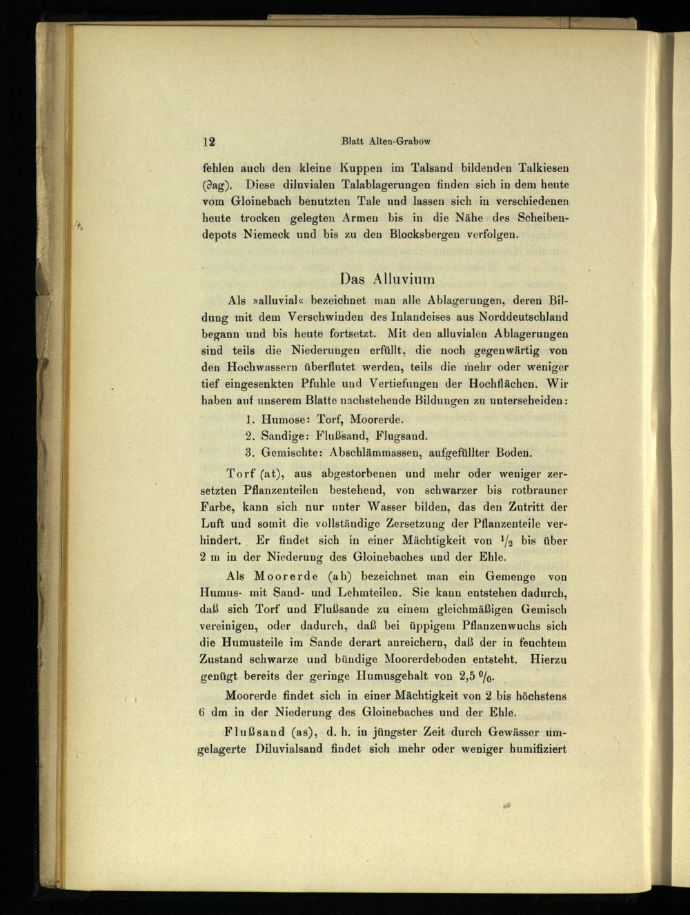 Als»alluvial« bezeichnet man alle Ablagerungen, deren Bildung mit dem Verschwinden des Inlandeises aus Norddeutschland begann und bis heute fortsetzt. Mit den alluvialen Ablagerungen sind teils die Niederungen erfüllt, die noch gegenwärtig von den Hochwassern überflutet werden, teils die mehr oder weniger tief eingesenkten Pfuhle und Vertiefungen der Hochflächen. Wir haben auf unserem Blatte nachstehende Bildungen zu unterseheiden: