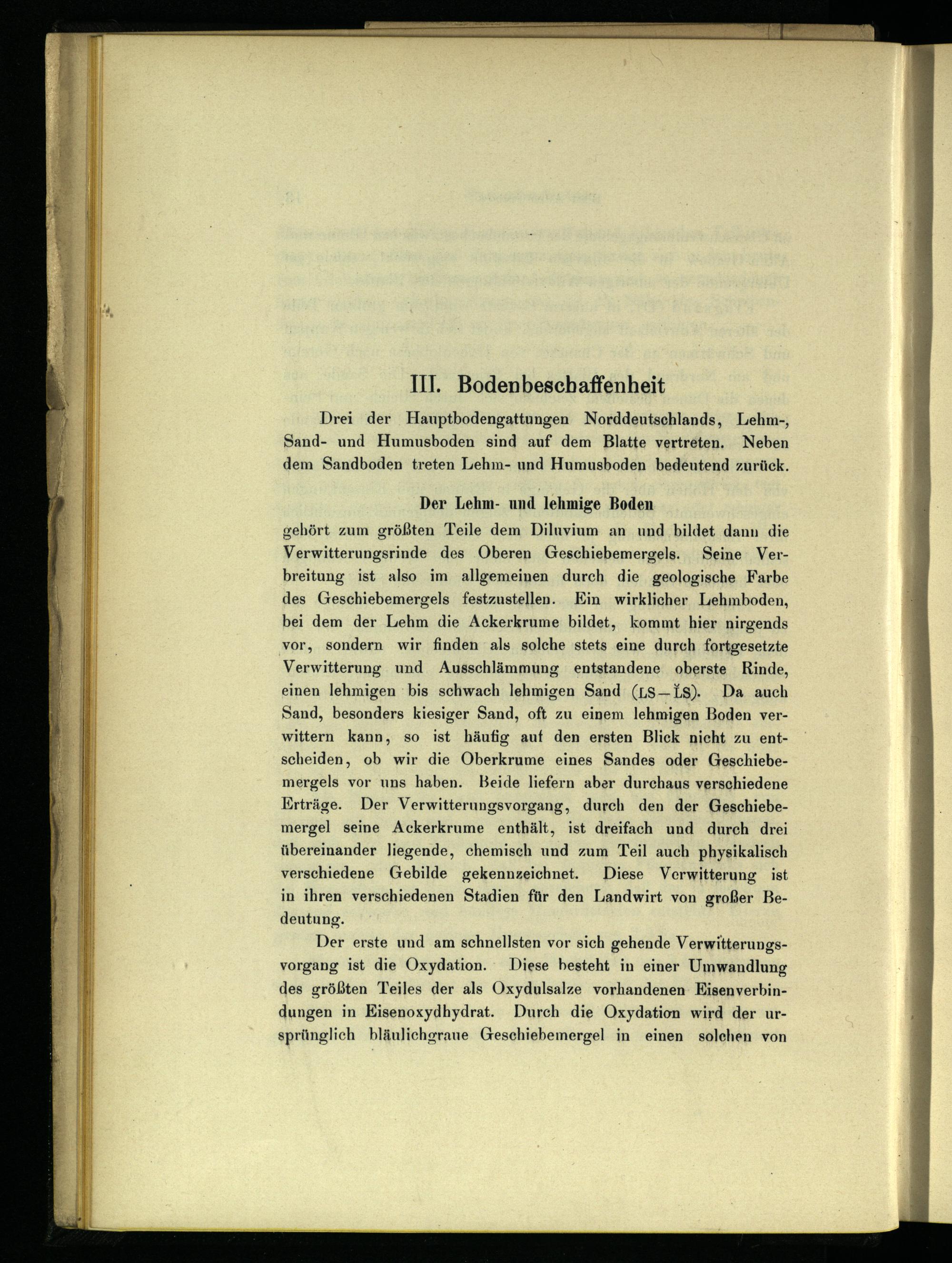 gehört zum größten Teile dem Diluvium an und bildet dann die Verwitterungsrinde des Oberen Geschiebemergels. Seine Verbreitung ist also im allgemeinen durch die geologische Farbe des Geschiebemergels festzustellen. Ein wirklicher Lehmboden, bei dem der Lehm die Ackerkrume bildet, kommt hier nirgends vor, sondern wir finden als solche stets eine durch fortgesetzte Verwitterung und Ausschlämmung entstandene oberste Rinde, einen lehmigen bis schwach lehmigen Sand(LS-—LS). Da auch Sand, besonders kiesiger Sand, oft zu einem lehmigen Boden verwittern kann, so ist häufig auf den ersten Blick nicht zu entscheiden, ob wir die Oberkrume eines Sandes oder Geschiebemergels vor uns haben. Beide liefern aber durchaus verschiedene Erträge. Der Verwitterungsvorgang, durch den der Geschiebemergel seine Ackerkrume enthält, ist dreifach und durch drei übereinander liegende, chemisch und zum Teil auch physikalisch verschiedene Gebilde gekennzeichnet. Diese Verwitterung ist in ihren verschiedenen Stadien für den Landwirt von großer Bedeutung.