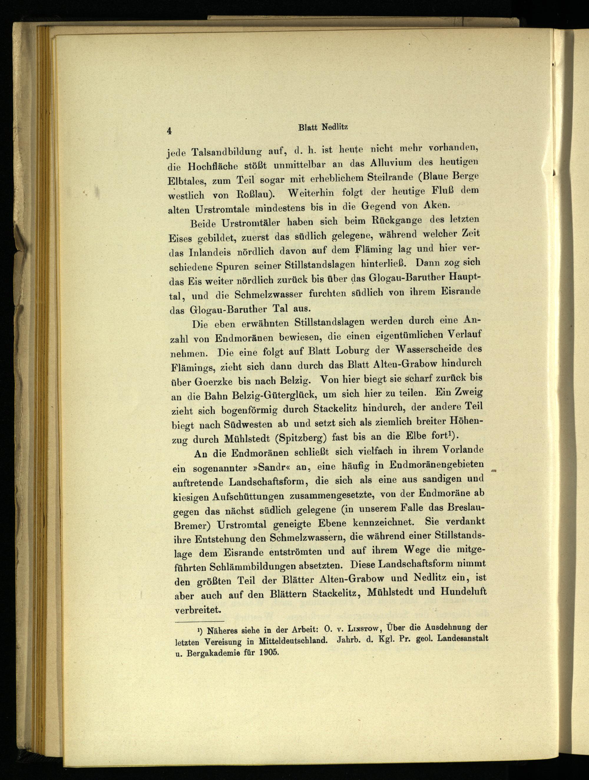 An die Endmoränen schließt sich vielfach in ihrem Vorlande ein sogenannter»Sandr« an, eine häufig in Endmoränengebieten auftretende Landschaftsform, die sich als eine aus sandigen und kiesigen Aufschüttungen zusammengesetzte, von der Endmoräne ab gegen das nächst südlich gelegene(in unserem Falle das BreslauBremer) Urstromtal geneigte Ebene kennzeichnet. Sie verdankt ihre Entstehung den Schmelzwassern, die während einer Stillstandslage dem Eisrande entströmten und auf ihrem Wege die mitgeführten Schlämmbildungen absetzten. Diese Landschaftsform nimmt den größten Teil der Blätter Alten-Grabow und Nedlitz ein, ist aber auch auf den Blättern Stackelitz , Mühlstedt und Hundeluft verbreitet.